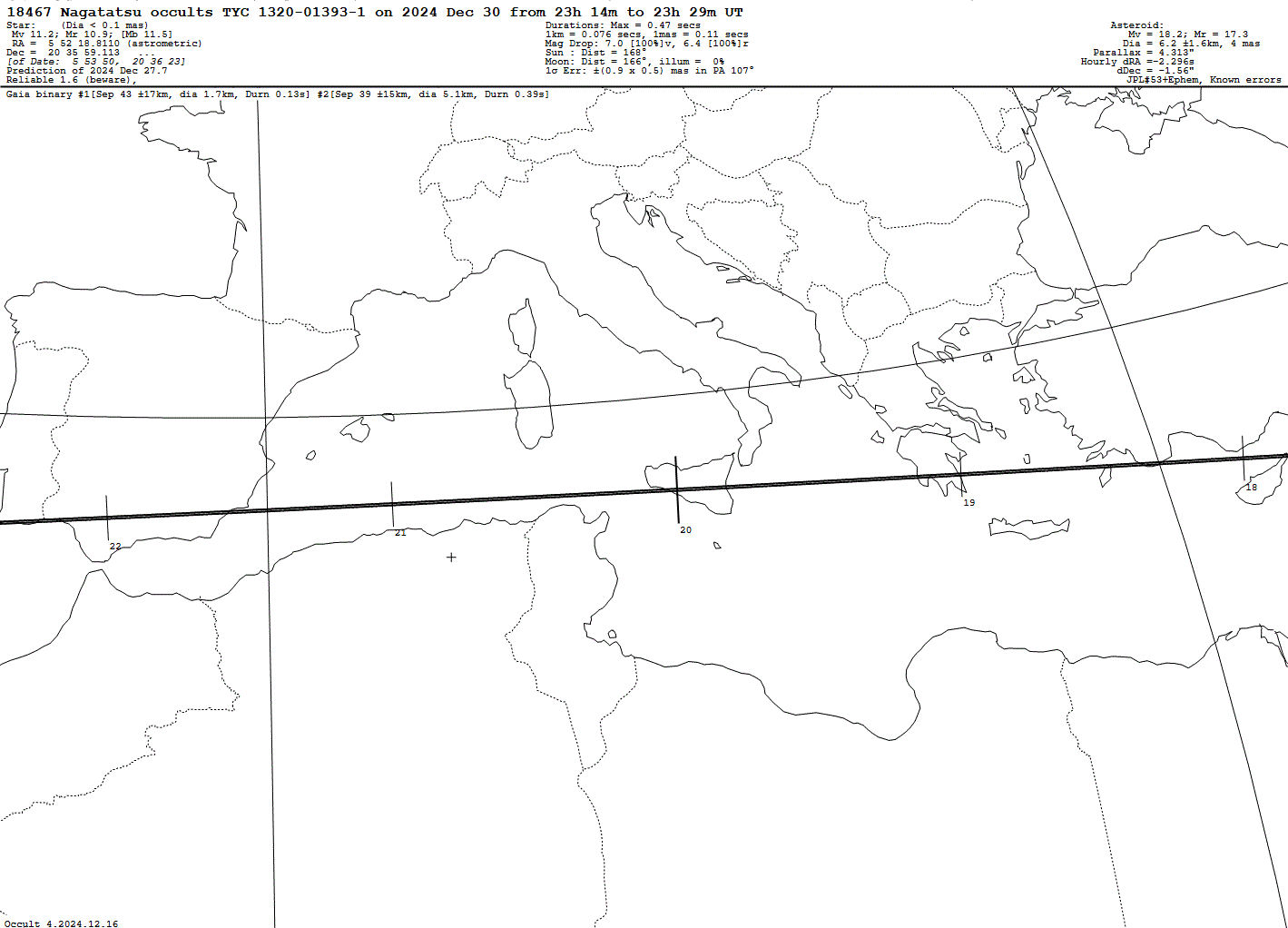 Binary asteroid! Short max. duration of only 0.47 s! Last update: 2024 Dec 27, Occult Watcher Cloud: https://cloud.occultwatcher.net/event/1459-18467-83369-649295-T01393-1 Post navigation 2024 Dec 30 ~22:03 UT: (1149) Volga occults UCAC4 534-034421 (14.2 mag) 2024 Dec 31 ~00:59 UT: (137805) 1999 YK5 occults TYC 4147-00186-1 (9.8 mag)