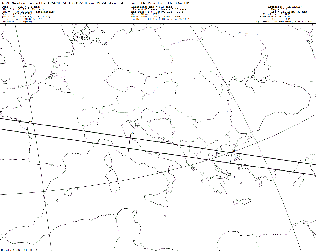 2024 Jan 04 ~01:29 UT: (659) Nestor occults UCAC4 583-039558 (15.0 mag)