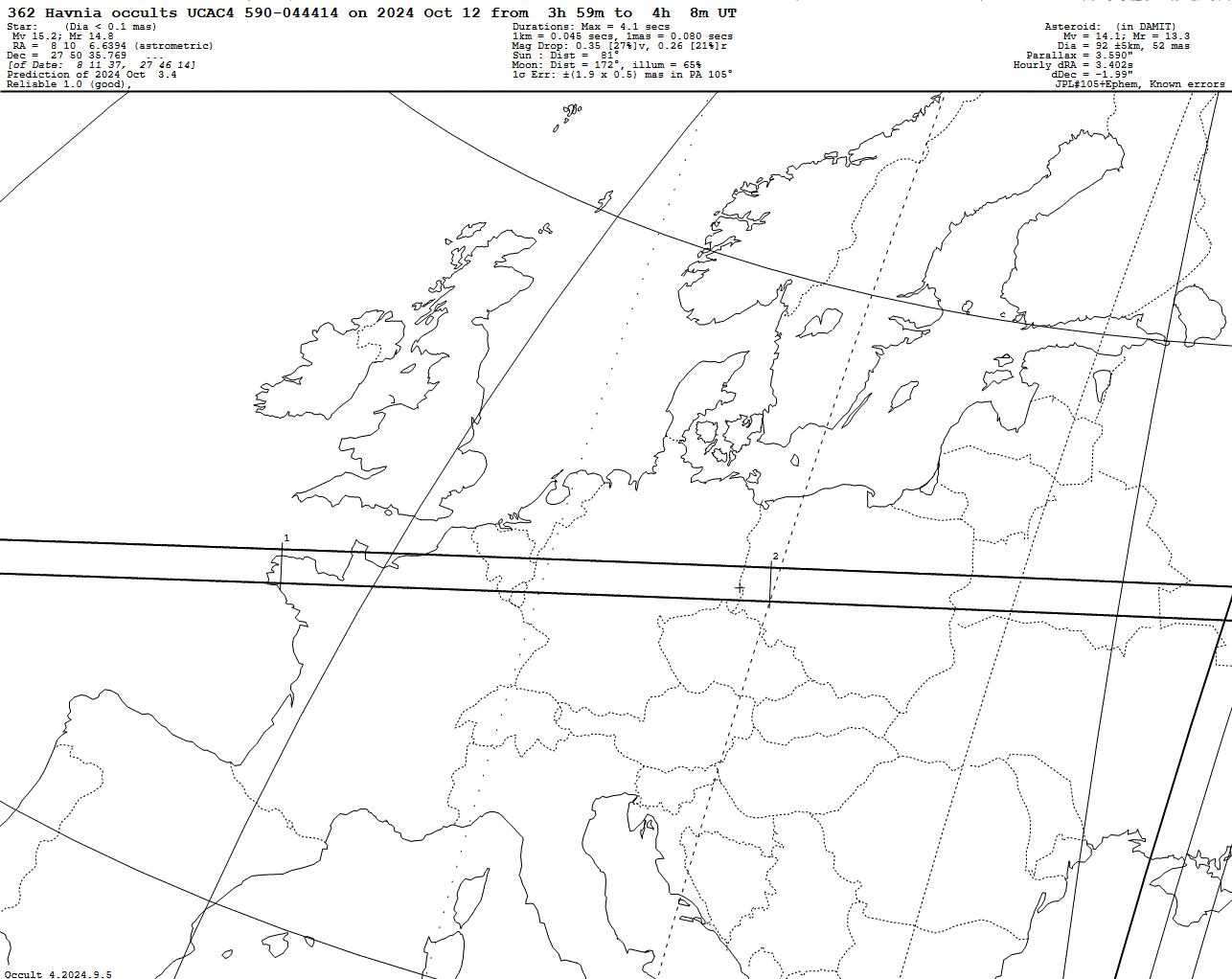 Very faint star! Last update: 2024 Oct 03, Occult Watcher Cloud: https://cloud.occultwatcher.net/event/1380-362-115835-649745-U044414 Post navigation 2024 Oct 11 ~22:06 UT: (4867) Polites occults UCAC4 572-00029 (14.4 mag) 2024 Oct 13 ~04:50 UT: (3864) Soren occults UCAC4 580-032602 (13.0 mag)