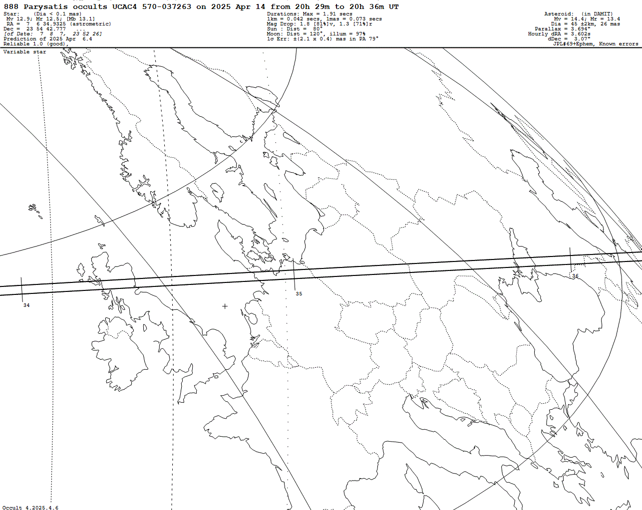 Last update: 2025 Apr 06, Occult Watcher Cloud: https://cloud.occultwatcher.net/event/1564-888-100872-649500-U037263 Post navigation 2025 Apr 14 ~19:59 UT: (888) Parysatis occults UCAC4 570-037258 (13.8 mag) 2025 Apr 14 ~23:54 UT: (41290) 1999 XB190 occults TYC 6195-01706-1 (10.0 mag)