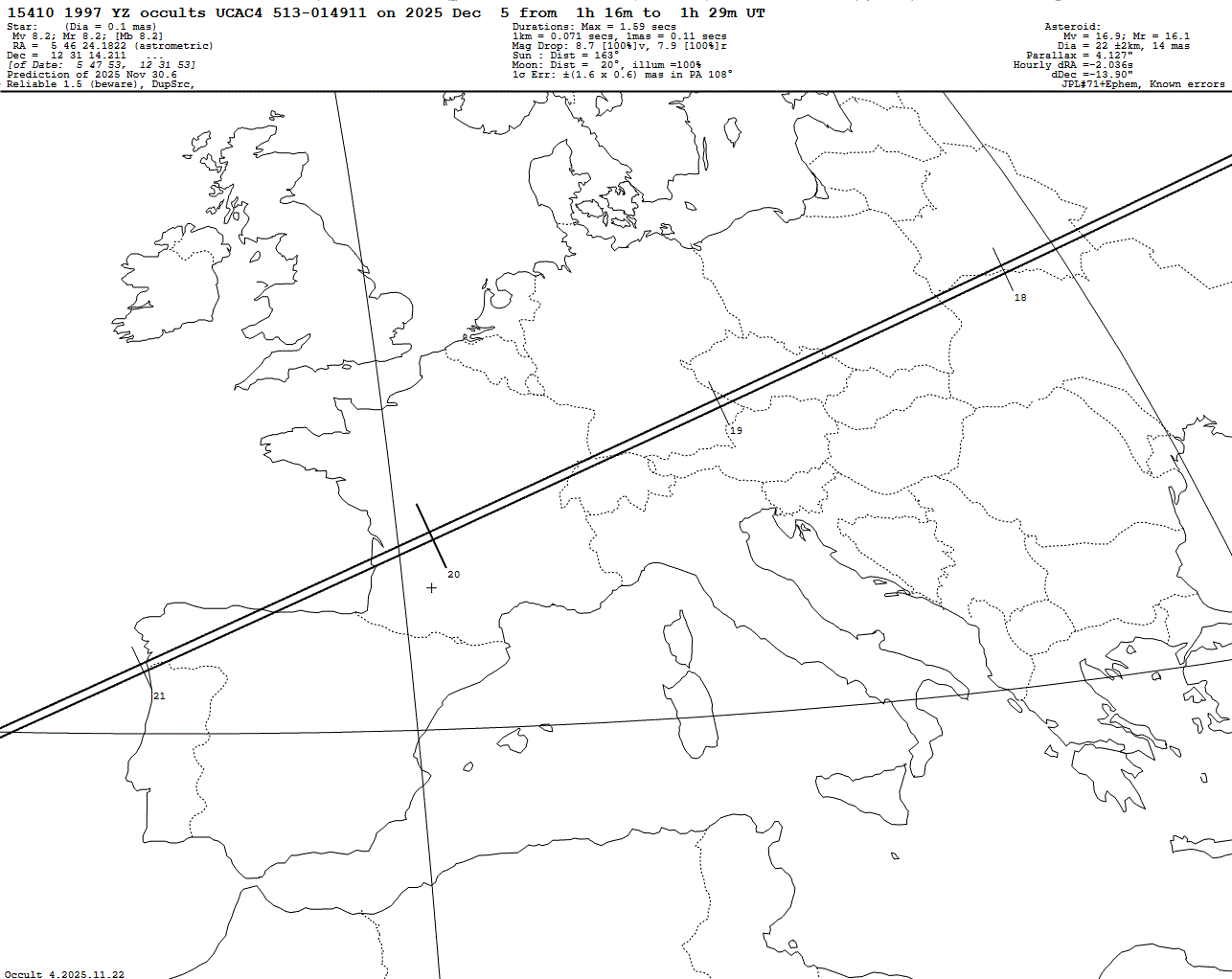 2025 Dec 05 ~01:17 UT: (15410) 1997 YZ occults UCAC4 513-014911 (8.2 mag)