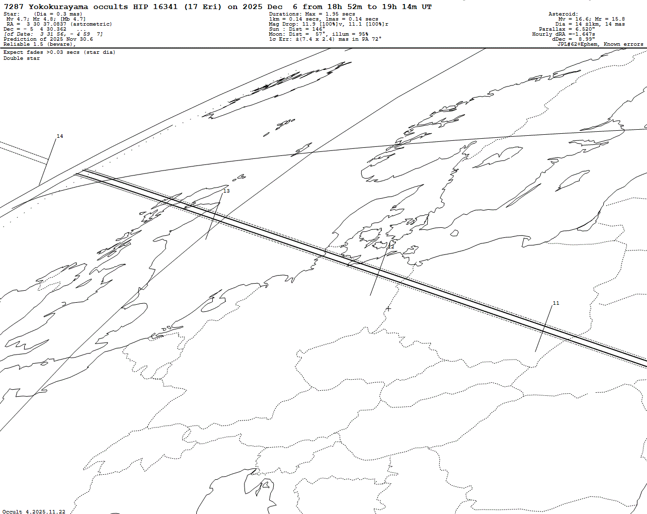 Very bright star! Last update: 2025 Nov 30, Occult Watcher Cloud: https://cloud.occultwatcher.net/event/1800-7287-49935-647687-H16341 Post navigation 2025 Dec 05 ~21:52 UT: (2859) Paganini occults HIP 3355 (8.6 mag) 2025 Dec 11 ~18:24 UT: (2660) Wasserman occults HIP 100168 (8.0 mag)