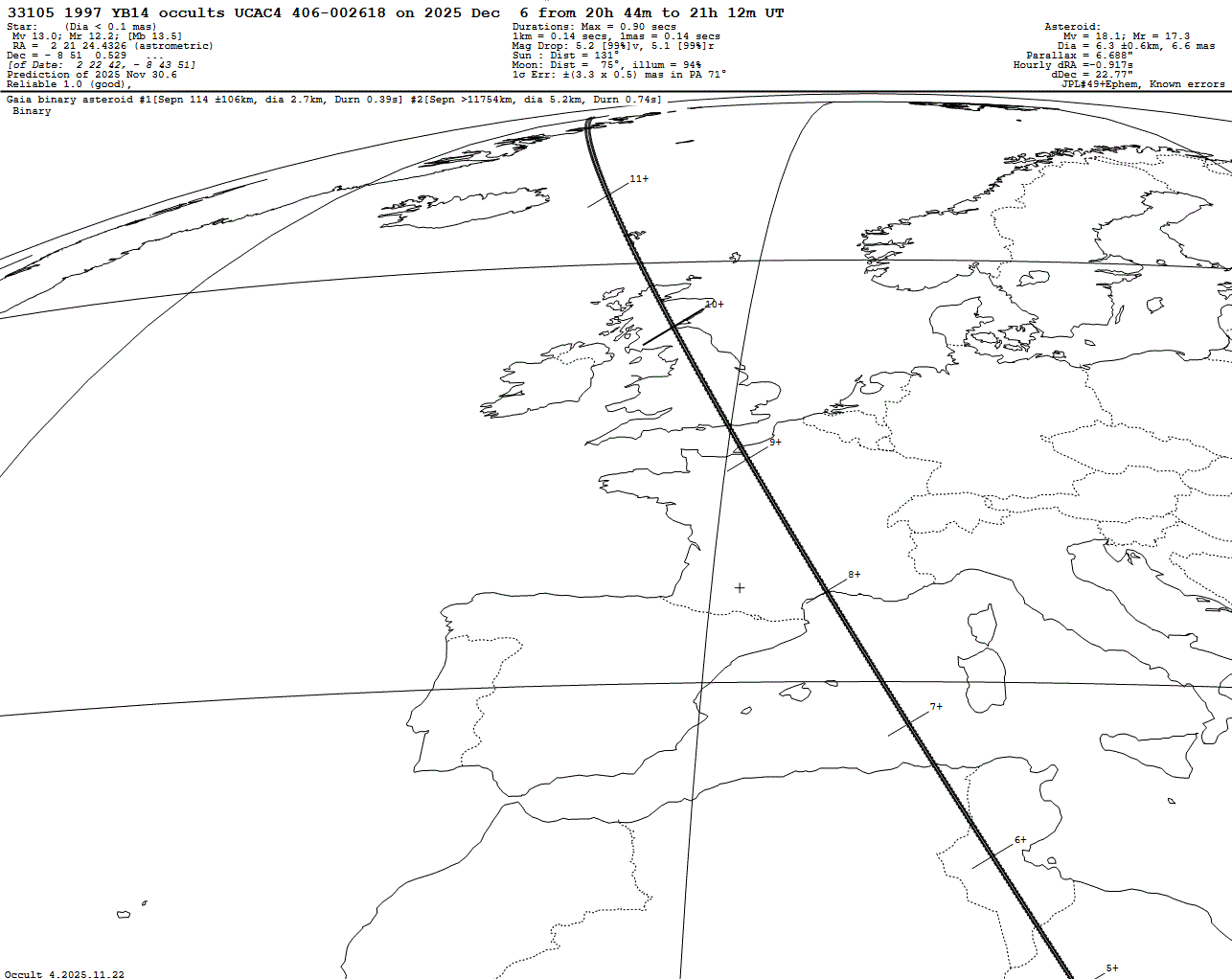 Suspected binary asteroid! Faint star! Short max. duration of only 0.90 s! Last update: 2025 Nov 30, Occult Watcher Cloud: https://cloud.occultwatcher.net/event/1800-33105-33625-647451-U002618 GAIAMOONS link: https://gaiamoons.imcce.fr/occ.php?p=53451 Post navigation 2025 Dec 07 ~17:27 UT: (23288) 2000 YG123 occults HIP 105782 (6.8 mag)