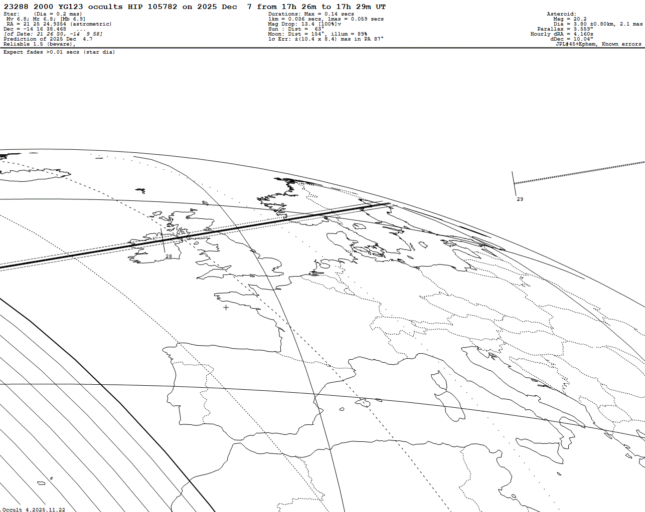 Bright star! Very short max. duration of only 0.14 s! Last update: 2025 Dec 04, Occult Watcher Cloud: not in database Post navigation 2025 Dec 07 ~19:54 UT: (22939) Handlin occults TYC 1373-00108-1 (8.9 mag) 2025 Dec 06 ~21:07 UT: (33105) 1997 YB14 occults UCAC4 406-002618 (13.0 mag)