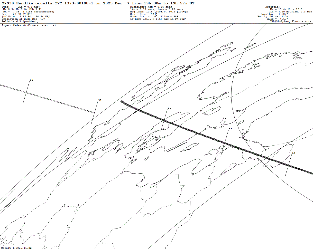 Bright star! Short max. duration of only 0.55 s! Last update: 2025 Dec 04, Occult Watcher Cloud: https://cloud.occultwatcher.net/event/1801-22939-107826-649293-T00108-1 Post navigation 2025 Dec 07 ~20:06 UT: (18500) 1996 NX3 occults TYC 1842-00116-1 (8.3 mag) 2025 Dec 07 ~17:27 UT: (23288) 2000 YG123 occults HIP 105782 (6.8 mag)