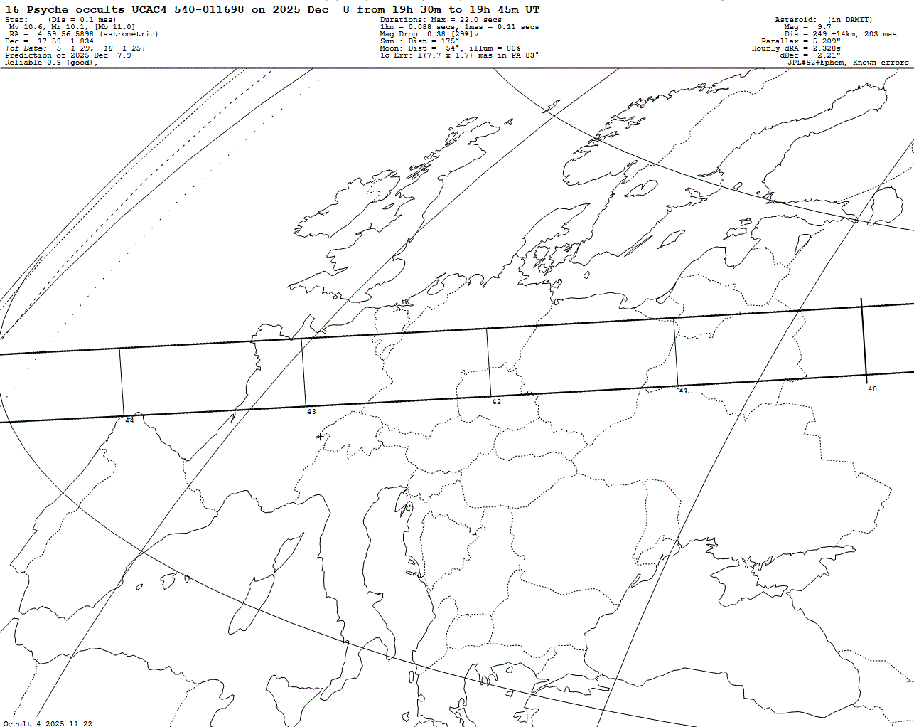 2025 Dec 08 ~19:40 UT: (16) Psyche occults UCAC4 540-011698 (10.4 mag)