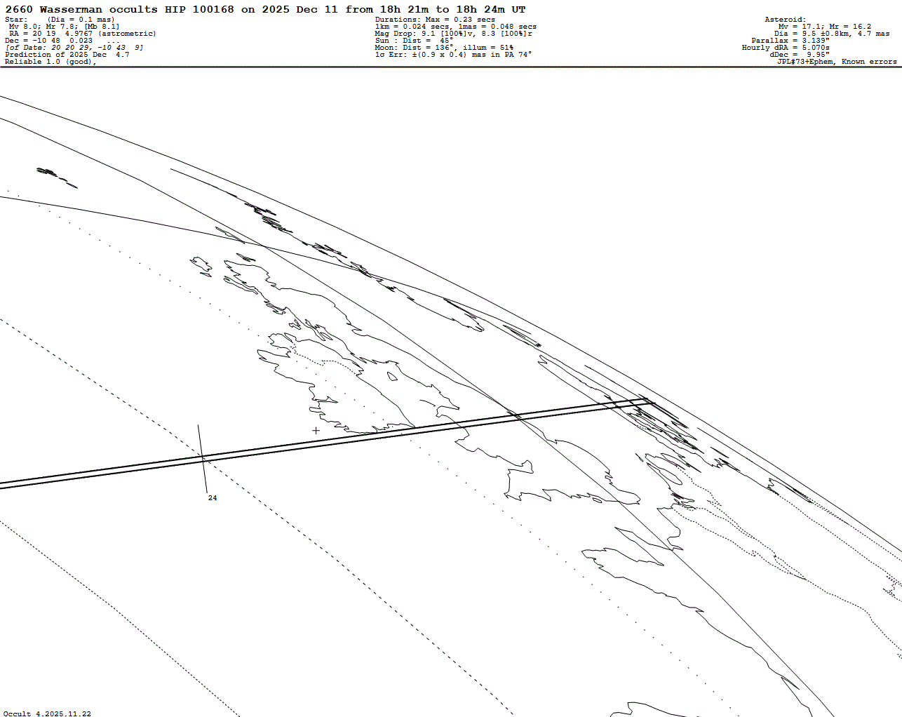 Bright star! Short max. duration of only 0.23 s! Last update: 2025 Dec 04, Occult Watcher Cloud: https://cloud.occultwatcher.net/event/1805-2660-287572-647326-H100168 Post navigation 2025 Dec 06 ~19:10 UT: (7287) Yokokurayama occults HIP 16341 (4.7 mag) 2025 Dec 10 ~21:34 UT: (13997) 1993 FB32 occults TYC 1319-01458-1 (8.5 mag)
