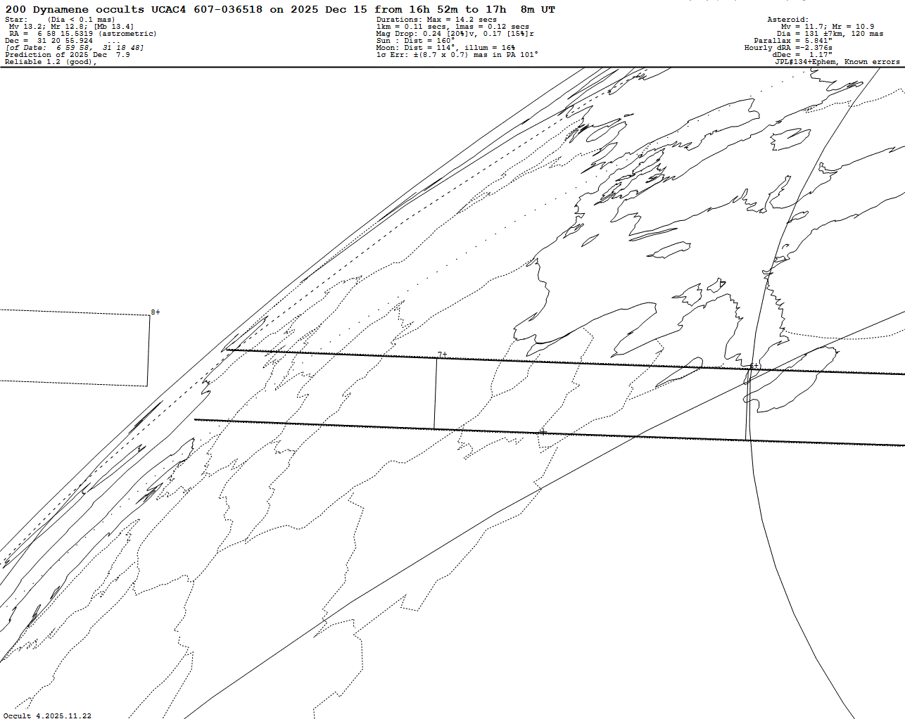 Slow-rotating asteroid! Faint star! Faint mag drop of only 0.24 mag! Last update: 2025 Dec 07, Occult Watcher Cloud: https://cloud.occultwatcher.net/event/1809-200-98951-649967-U036518 Post navigation 2025 Dec 15 ~22:23 UT: (24332) Shaunalinn occults HIP 19641 (5.8 mag) 2025 Dec 13 ~19:15 UT: (20822) Lintingnien occults HIP 39839 (6.8 mag)