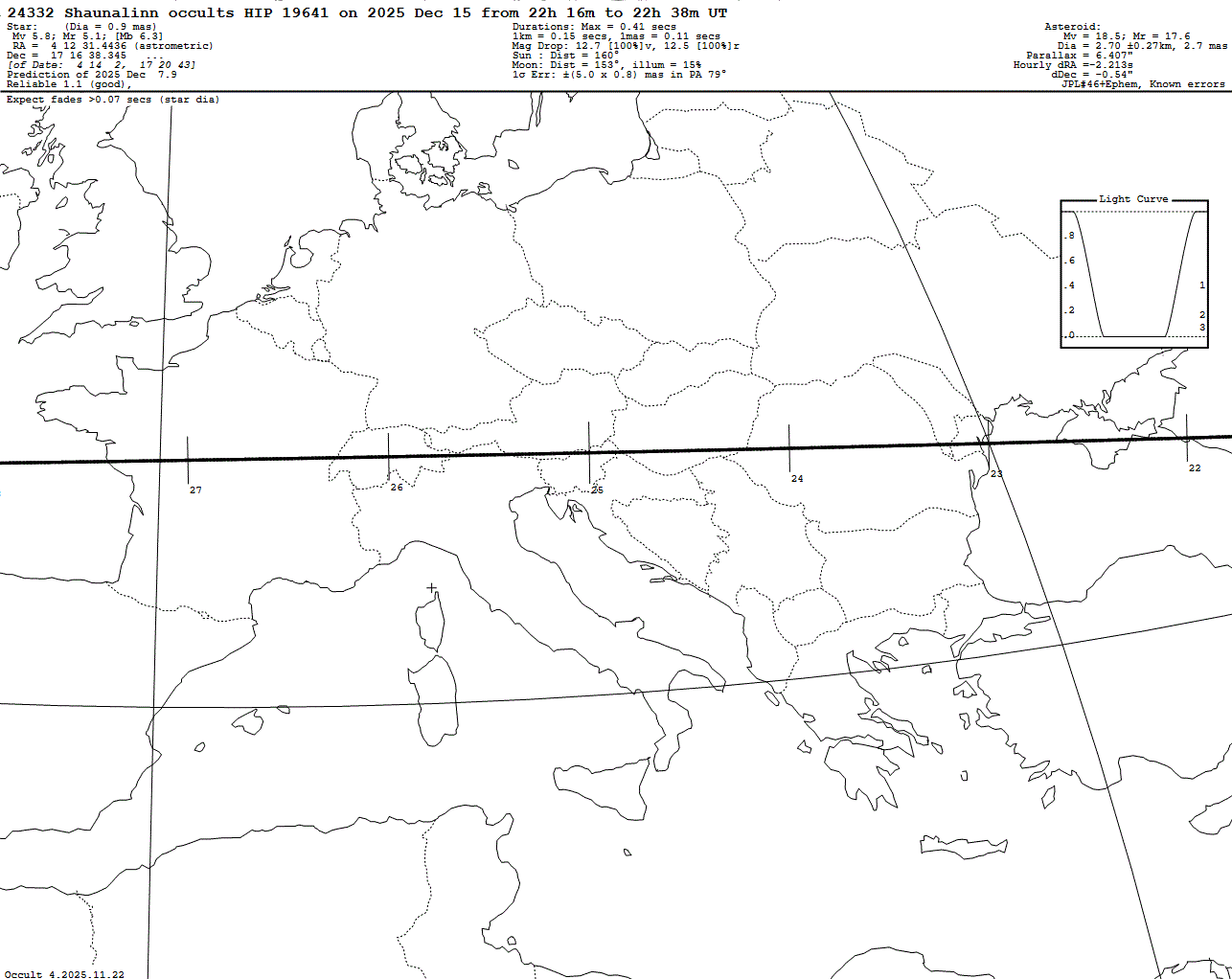 Bright star! Short max. duration of only 0.41 s! Last update: 2025 Dec 07, Occult Watcher Cloud: https://cloud.occultwatcher.net/event/1809-24332-59857-649090-H19641 Post navigation 2025 Dec 10 ~01:38 UT: (9318) 1988 RG9 occults UCAC4 550-021348 (8.9 mag) 2025 Dec 15 ~17:06 UT: (200) Dynamene occults UCAC4 607-036518 (13.2 mag)