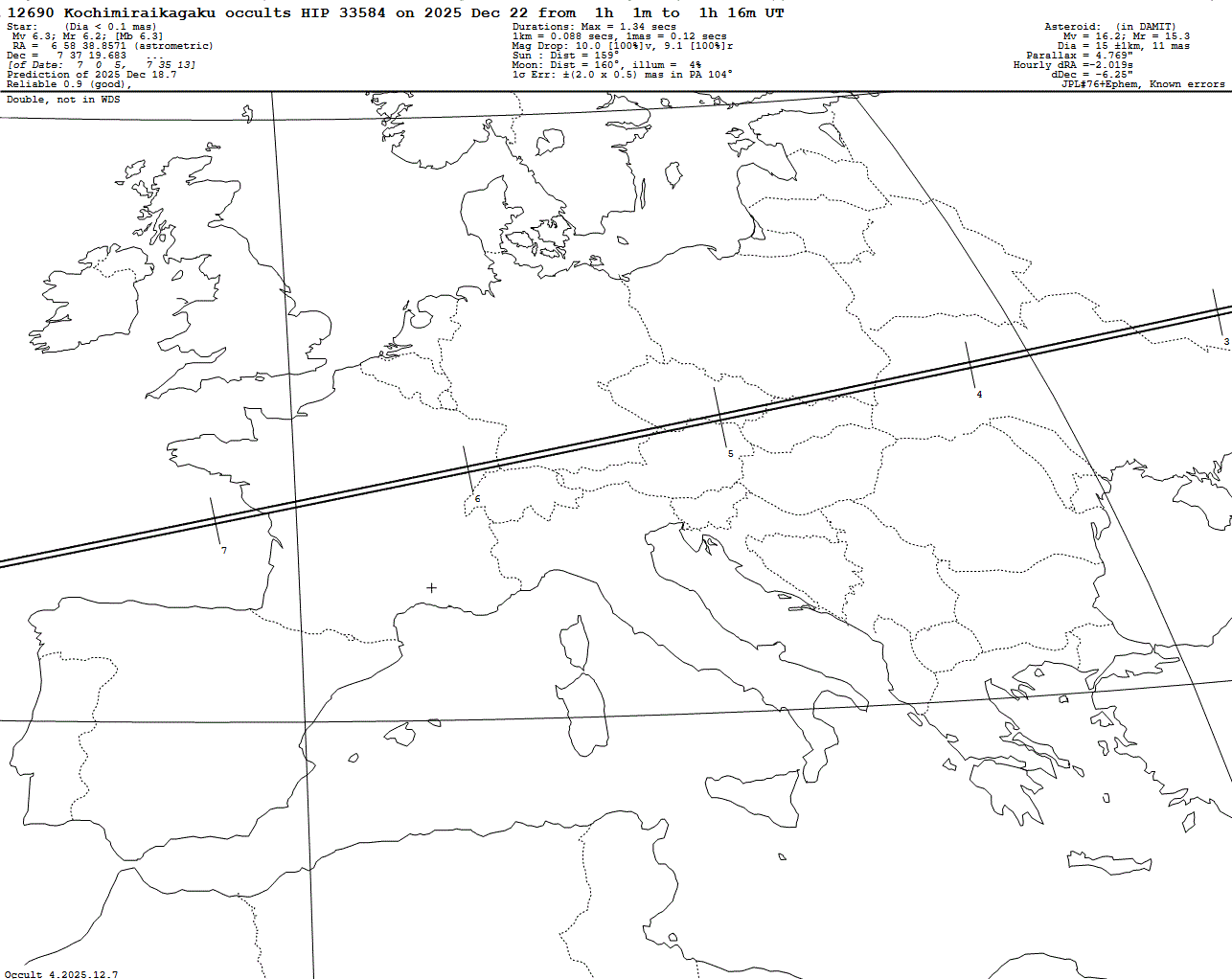 2025 Dec 22 ~01:04 UT: (12690) Kochimiraikagaku occults HIP 33584 (6.3 mag)