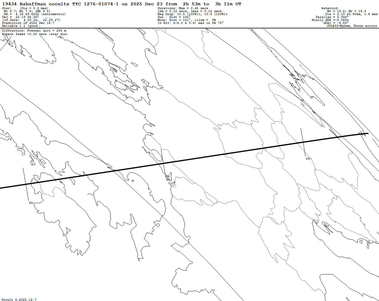 Bright star! Very short max. duartion of only 0.25 s! Last update: 2025 Dec 18, Occult Watcher Cloud: https://cloud.occultwatcher.net/event/1817-19434-61355-649407-T01074-1 Post navigation 2025 Dec 23 ~01:54 UT: (34) Circe occults UCAC4 521-028885 (11.4 mag) 2025 Dec 24 ~04:02 UT: (29526) 1998 AV occults UCAC4 556-048279 (13.6 mag)