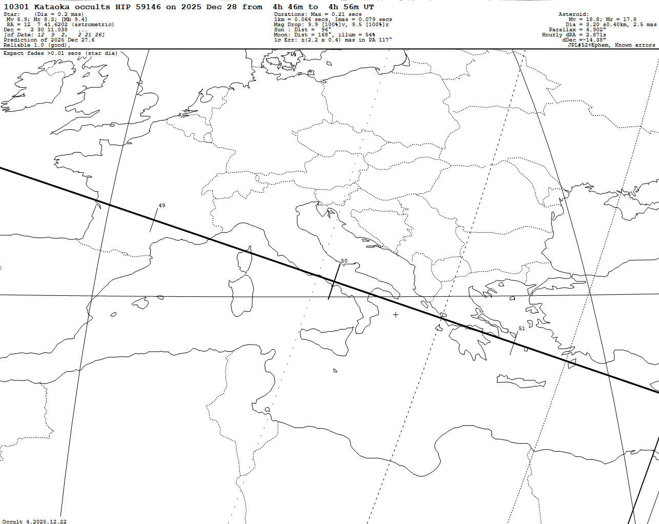 Bright star! Short max. duration of only 0.21 s! Last update: 2025 Dec 27, Occult Watcher Cloud: https://cloud.occultwatcher.net/event/1822-10301-171774-648148-H59146 Post navigation 2025 Dec 28 ~04:14 UT: (46333) 2001 QS276 occults UCAC4 464-048396 (14.1 mag) 2025 Dec 30 ~22:55 UT: (102) Miriam occults UCAC4 516-045230 (15.0 mag)