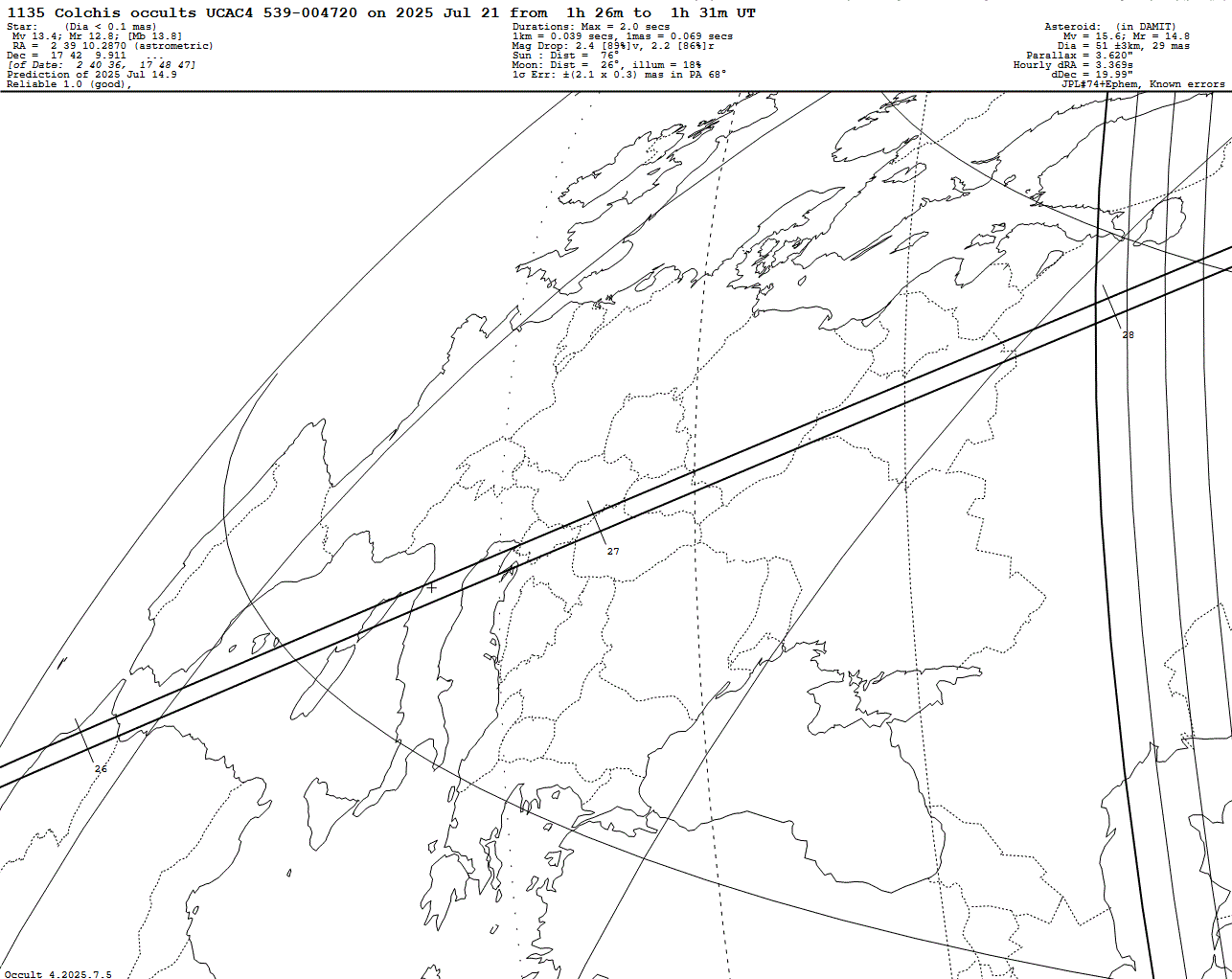 Faint star! Last update: 2025 Jul 14, Occult Watcher Cloud: https://cloud.occultwatcher.net/event/1662-1135-37839-649119-U004720 Post navigation 2025 Jul 21 ~00:27 UT: (67154) 2000 AJ194 occults UCAC4 419-129887 (11.2 mag) 2025 Jul 21 ~23:23 UT: (358914) 2008 GT128 occults UCAC4 402-104292 (11.9 mag)