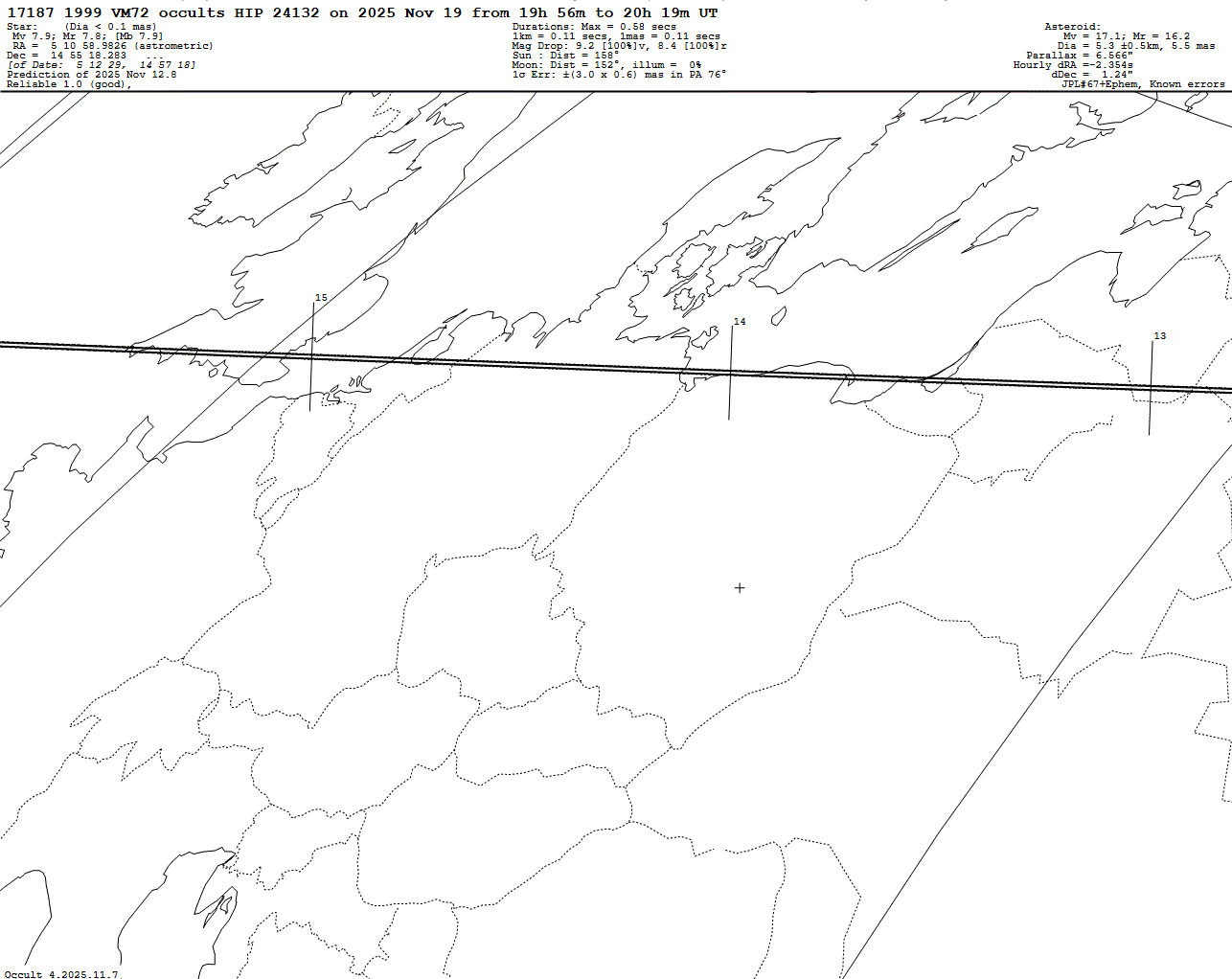 2025 Nov 19 ~20:12 UT: (17187) 1999 VM72 occults HIP 24132 (7.9 mag)