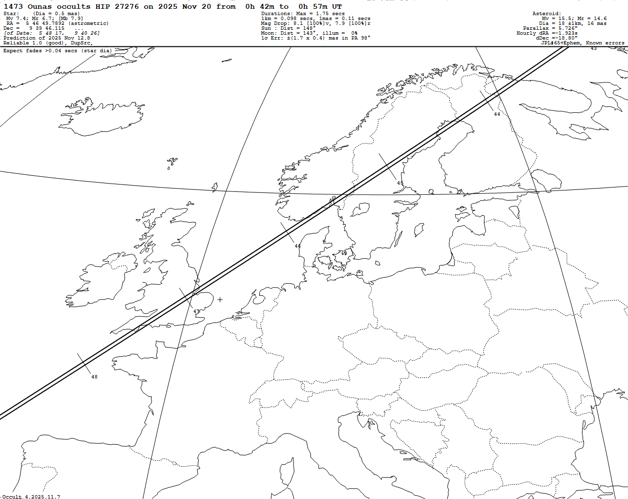 2025 Nov 20 ~00:43 UT: (1473) Ounas occults HIP 27276 (7.4 mag)