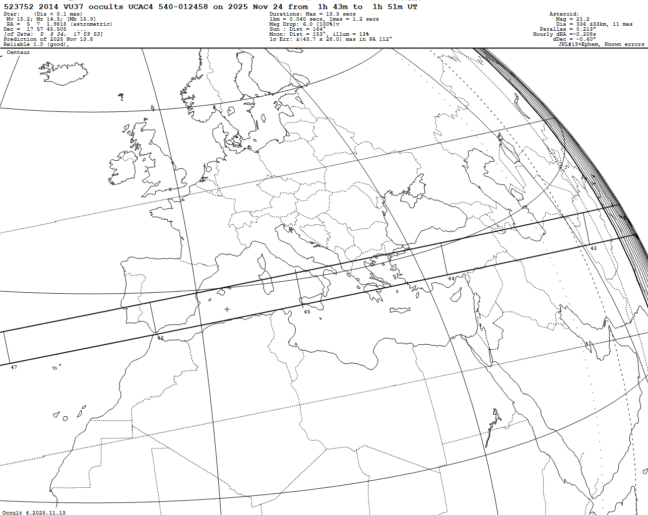 Centaur! Very faint star! 1-sigma error limits cover Europe! Last update: 2025 Nov 13, Occult Watcher Cloud https://cloud.occultwatcher.net/event/1788-523752-72705-649131-U012458 Prediction of the Lucky Star project (2025 Aug 21): https://lesia.obspm.fr/lucky-star/occ.php?p=148785 Post navigation 2025 Oct 25 ~18:41 UT: (530930) 2011 WG157 occults UCAC4 675-030022 (14.2 mag) 2025 Nov 19 ~23:52 UT: (78799) Xewioso occults UCAC4 623-036266 (15.5 mag)