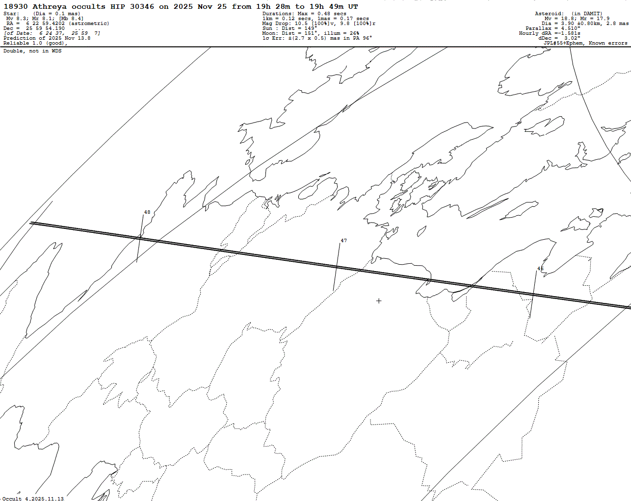 Bright star! Short max. duration of only 0.48 s! Last update: 2025 Nov 13, Occult Watcher Cloud: https://cloud.occultwatcher.net/event/1789-18930-90625-649633-H30346 Post navigation 2025 Nov 14 ~03:15 UT: (196138) 2002 TX253 occults UCAC4 648-017682 (13.1 mag) 2025 Nov 24 ~21:56 UT: (3206) Wuhan occults UCAC4 574-019758 (11.3 mag)