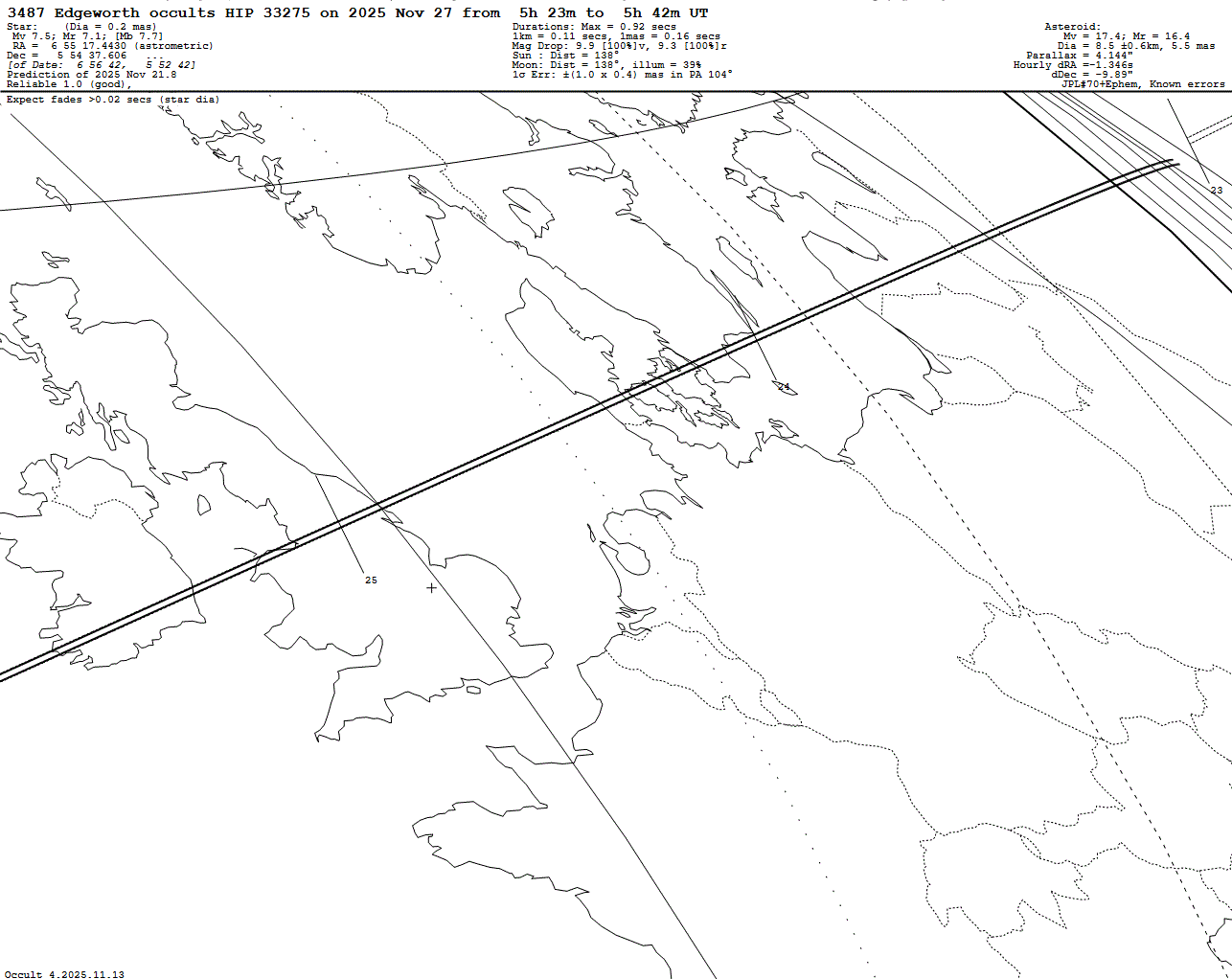 Bright star! Short max. duration of only 0.92 s! Last update: 2025 Nov 21, Occult Watcher Cloud: https://cloud.occultwatcher.net/event/1791-3487-98182-648369-H33275 Post navigation 2025 Nov 29 ~01:08 UT: (10562) 1993 UB1 occults TYC 3298-01516-1 (8.6 mag) 2025 Nov 27 ~03:20 UT: (8897) Defelice occults UCAC4 511-005737 (8.5 mag)
