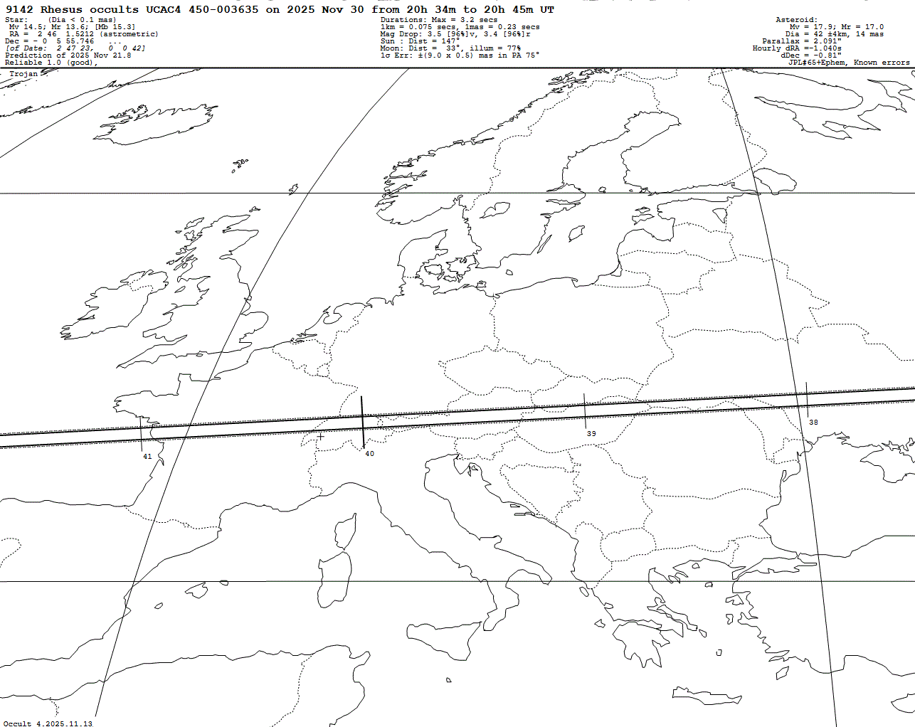 Jupiter Trojan! Very faint star! Last update: 2025 Nov 21, Occult Watcher Cloud: https://cloud.occultwatcher.net/event/1794-9142-39437-648001-U003635 Prediction of the Lucky Star project (2025 Aug 21): https://lesia.obspm.fr/lucky-star/occ.php?p=148039 Post navigation 2025 Nov 17 ~02:11 UT: (4867) Polites occults UCAC4 682-011200 (15.2 mag) 2025 Nov 29 ~01:08 UT: (10562) 1993 UB1 occults TYC 3298-01516-1 (8.6 mag)