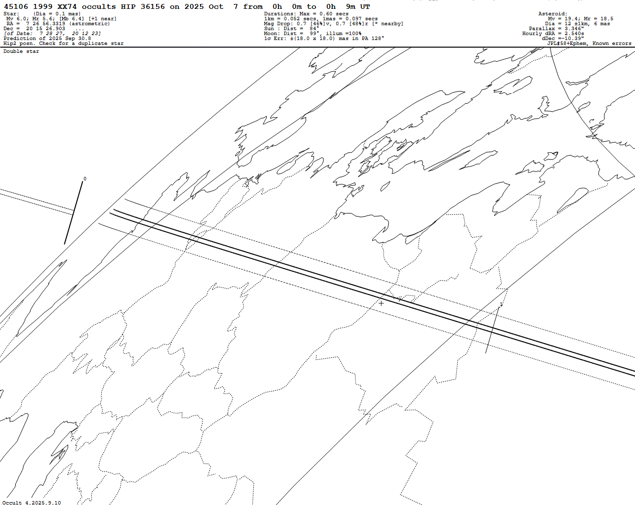 2025 Oct 07 ~00:00 UT: (45106) 1999 XX74 occults HIP 36156 (6.0 mag)