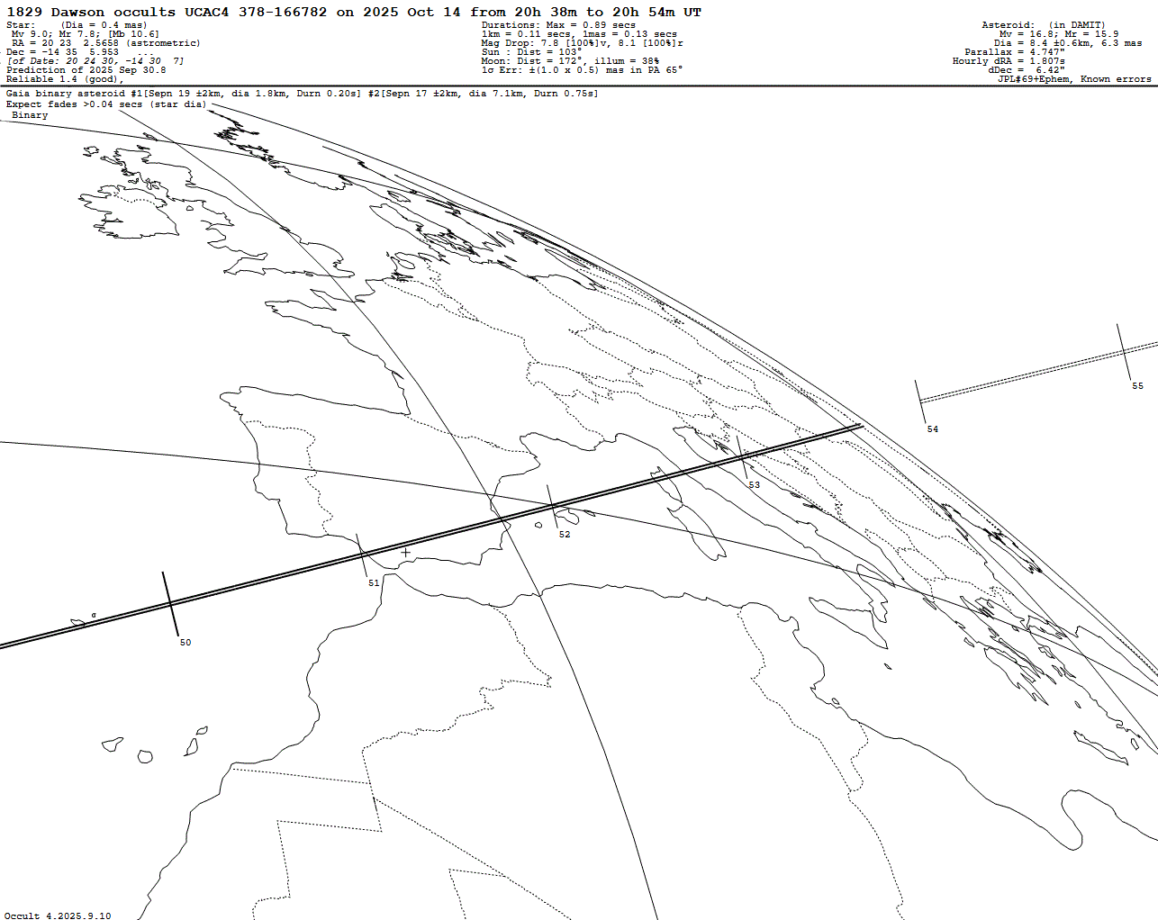 2025 Oct 14 ~20:50 UT: (1829) Dawson occults UCAC4 378-166782 (9.0 mag)