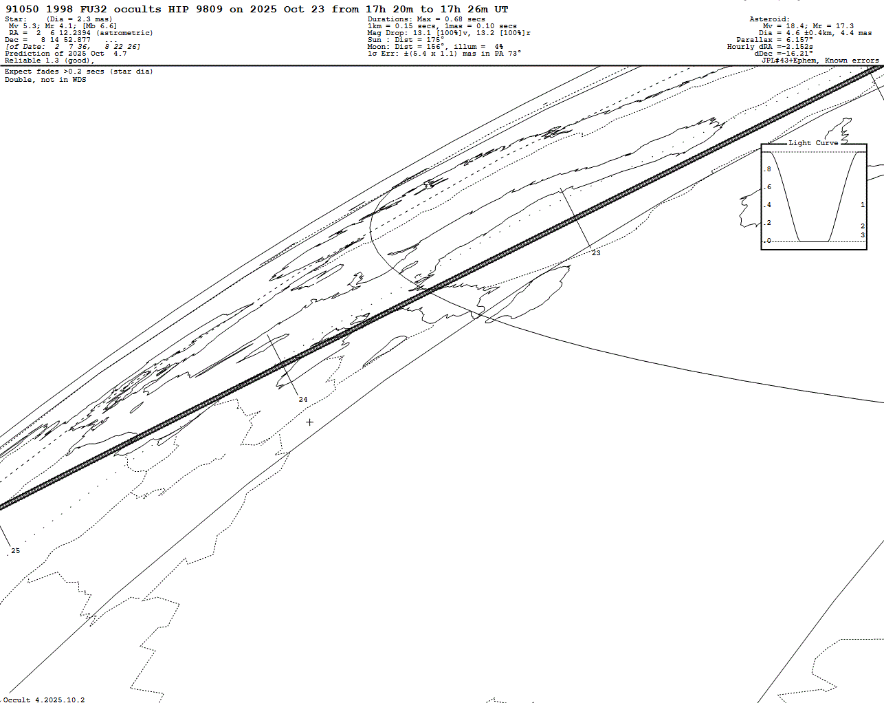 2025 Oct 23 ~17:22 UT: (91050) 1998 FU32 occults HIP 9809 (5.3 mag)