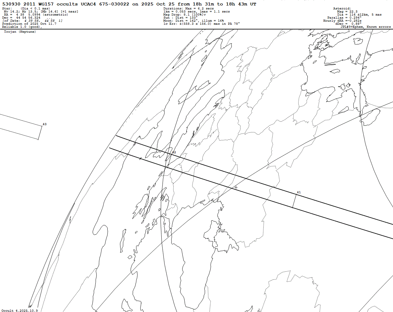2025 Oct 25 ~18:41 UT: (530930) 2011 WG157 occults UCAC4 675-030022 (14.2 mag)