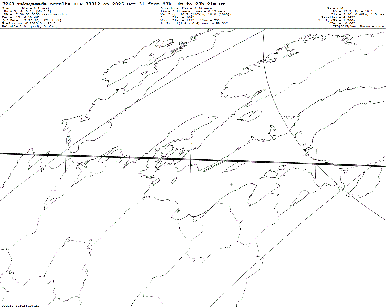 2025 Oct 31 ~23:04 UT: (7263) Takayamada occults HIP 38312 (8.5 mag)