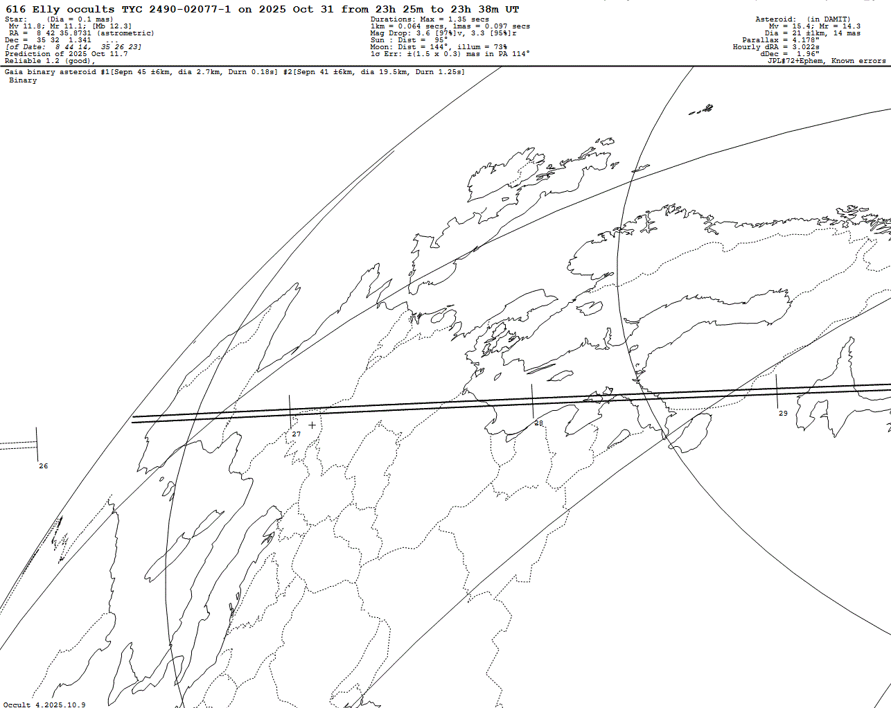 2025 Oct 31 ~23:26 UT: (616) Elly occults TYC 2490-02077-1 (11.8 mag)