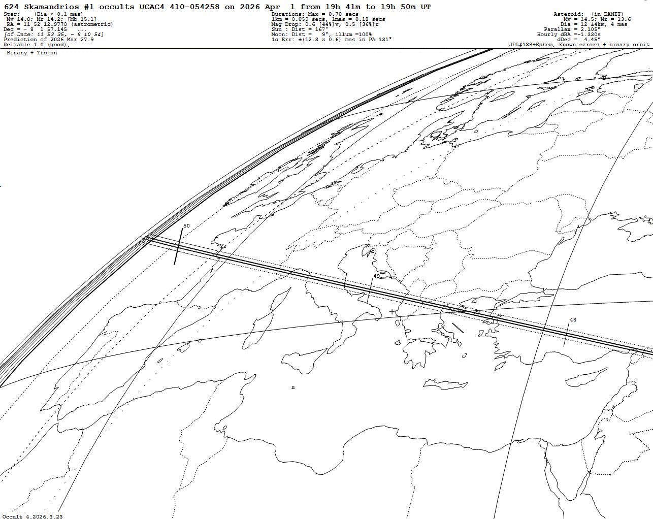 Jupiter Trojan! Satellite of (624) Hektor! Faint star! Short max. duration of only 0.7 s! Faint mag drop of only 0.6 mag! Last update: 2026 Mar 27 Post navigation 2025 Oct 09 ~01:51 UT: (702) Pichi Unem occults UCAC4 637-002866 (13.4 mag) 2026 Apr 01 ~19:47 UT: (624) Hektor occults UCAC4 410-054258 (14.8 mag)