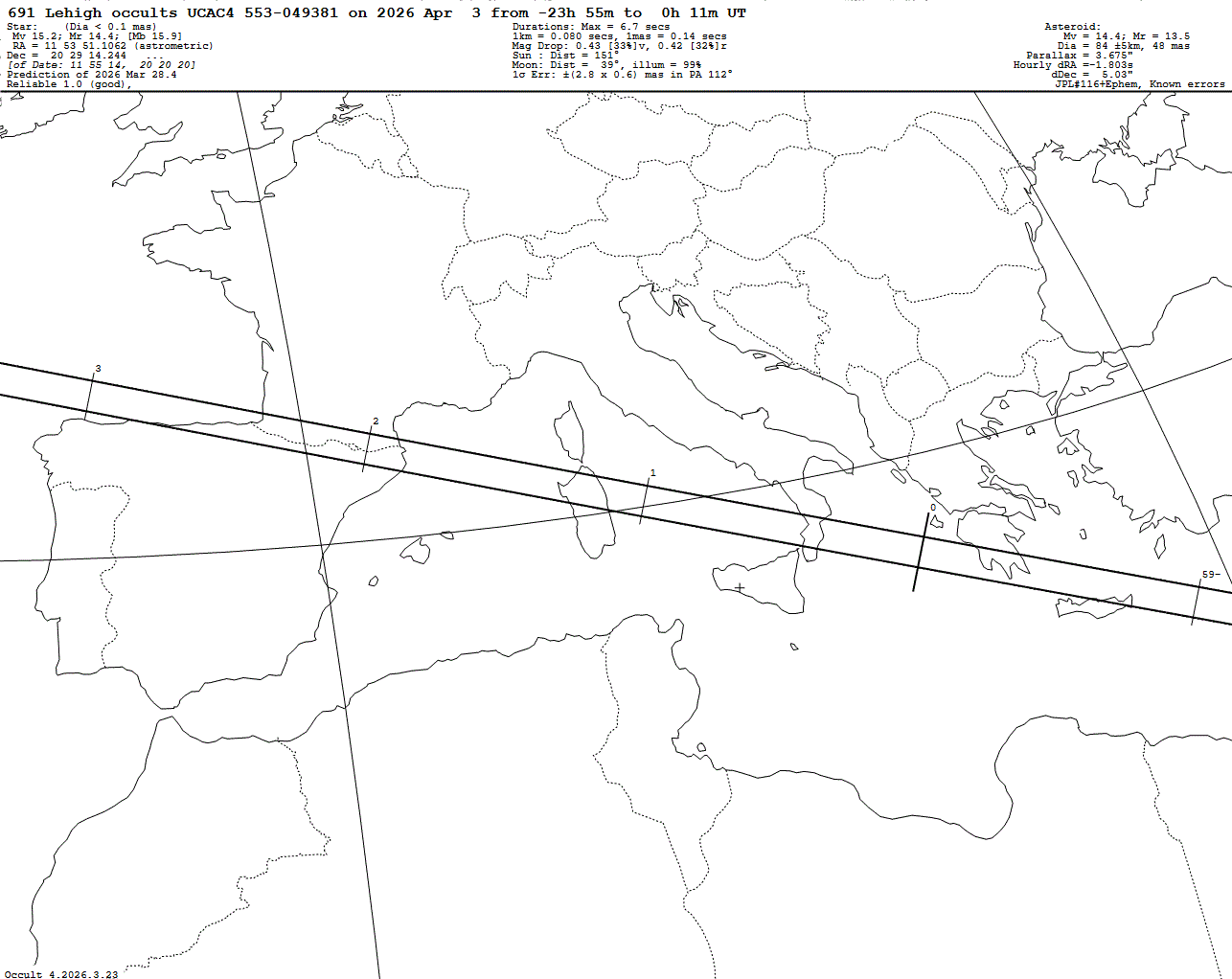 Slow-rotating asteroid! Very faint star! Faint mag drop of only 0.43 mag! Last update: 2026 Mar 28, Occult Watcher Cloud: https://cloud.occultwatcher.net/event/1918-691-168523-649278-U049381 Post navigation 2026 Apr 03 ~02:20 UT: (30047) 2000 EV35 occults UCAC4 480-054780 (12.8 mag) 2026 Apr 02 ~20:31 UT: (630) Euphemia occults HIP 48944 (7.8 mag)