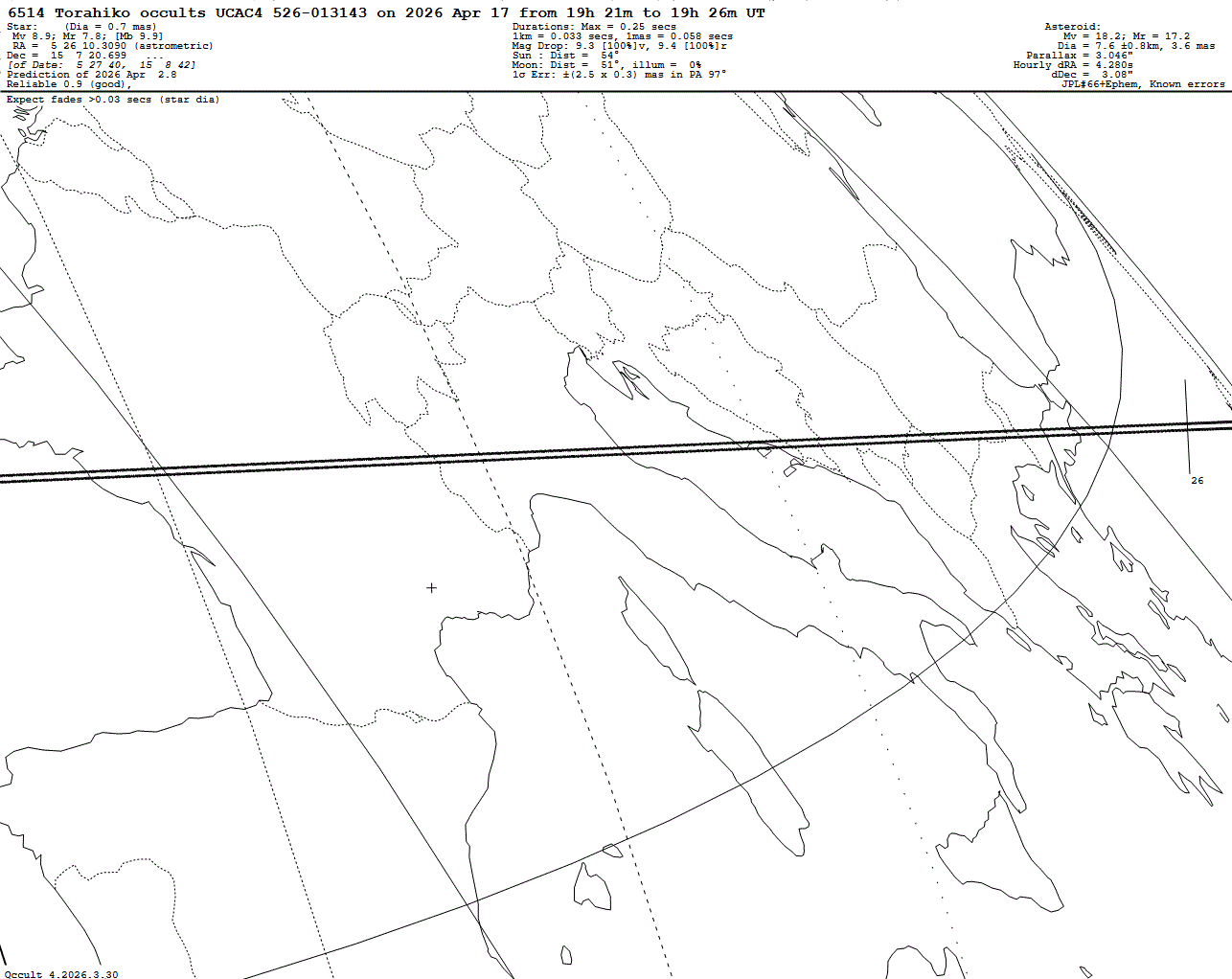 Bright star! Short max. duration of 0.25 s! Last update: 2026 Apr 02, Occult Watcher Cloud: https://cloud.occultwatcher.net/event/1932-6514-77205-648952-U013143 Post navigation 2025 Apr 17 ~21:15 UT: (309) Fraternitas occults UCAC4 383-065030 (14.6 mag) 2026 Apr 15 ~20:10 UT: (266) Aline occults UCAC4 508-028657 (13.2 mag)