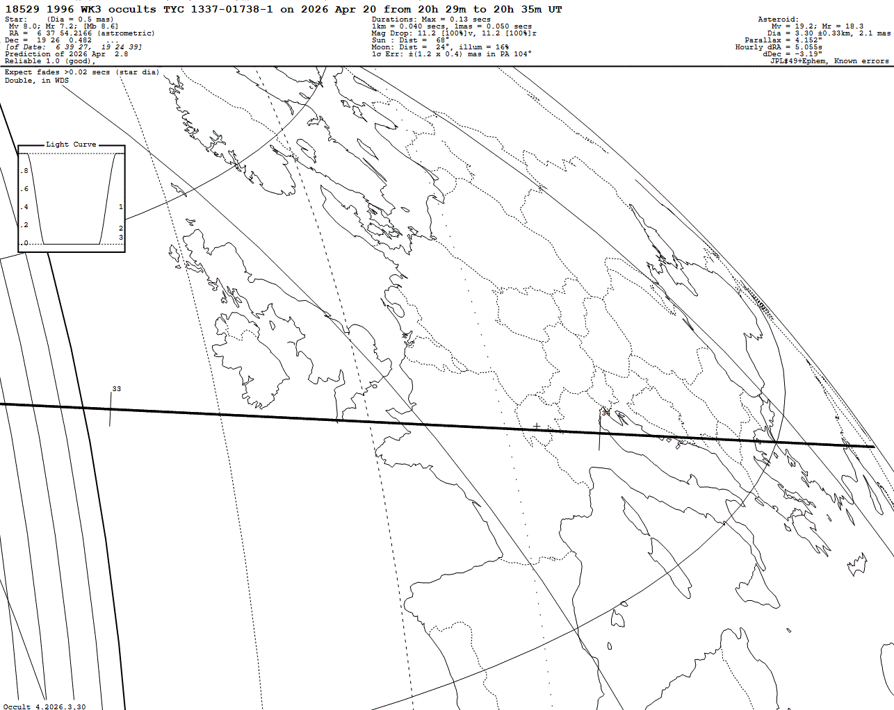 2026 Apr 20 ~20:33 UT: (18529) 1996 WK3 occults TYC 1337-01738-1 (8.0 mag)