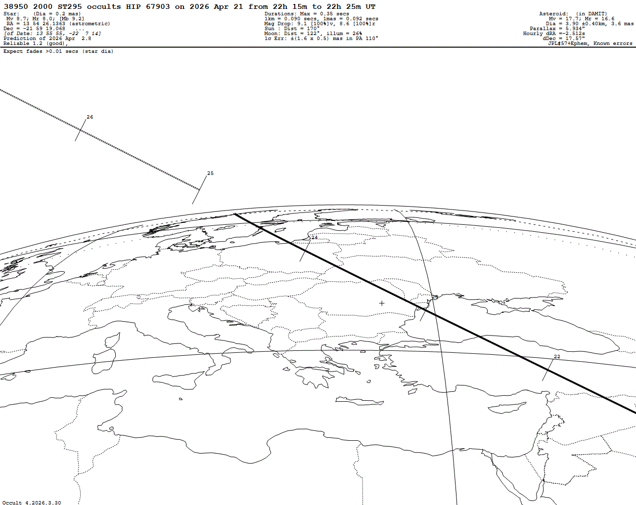 2026 Apr 21 ~22:21 UT: (38950) 2000 ST295 occults HIP 67903 (8.7 mag)