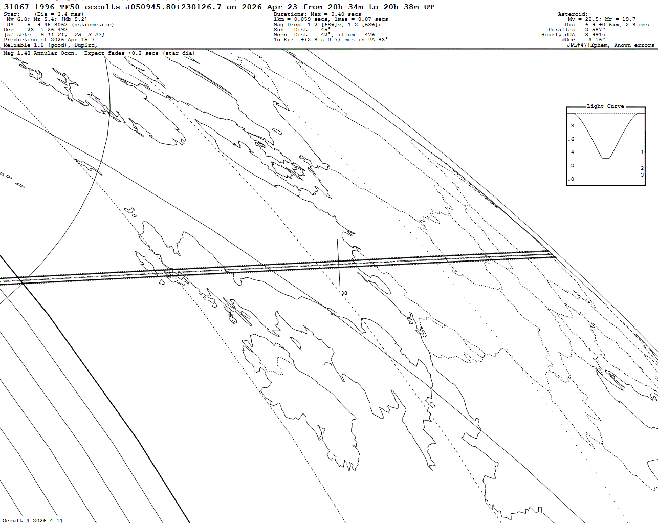 Bright star! Annular occultation due to star diameter! Short max. duration of 0.40 s! Last update: 2026 Apr 15, Occult Watcher Cloud: https://cloud.occultwatcher.net/event/1938-31067-73359-649449-J4580267 Post navigation 2026 Apr 23 ~21:40 UT: (35522) 1998 FY62 occults UCAC4 503-044433 (8.4 mag) 2026 Apr 23 ~01:10 UT: (42304) 2001 VZ34 occults HIP 51065 (6.8 mag)