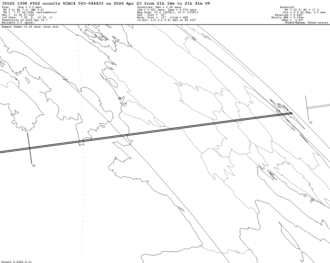 2026 Apr 23 ~21:40 UT: (35522) 1998 FY62 occults UCAC4 503-044433 (8.4 mag)