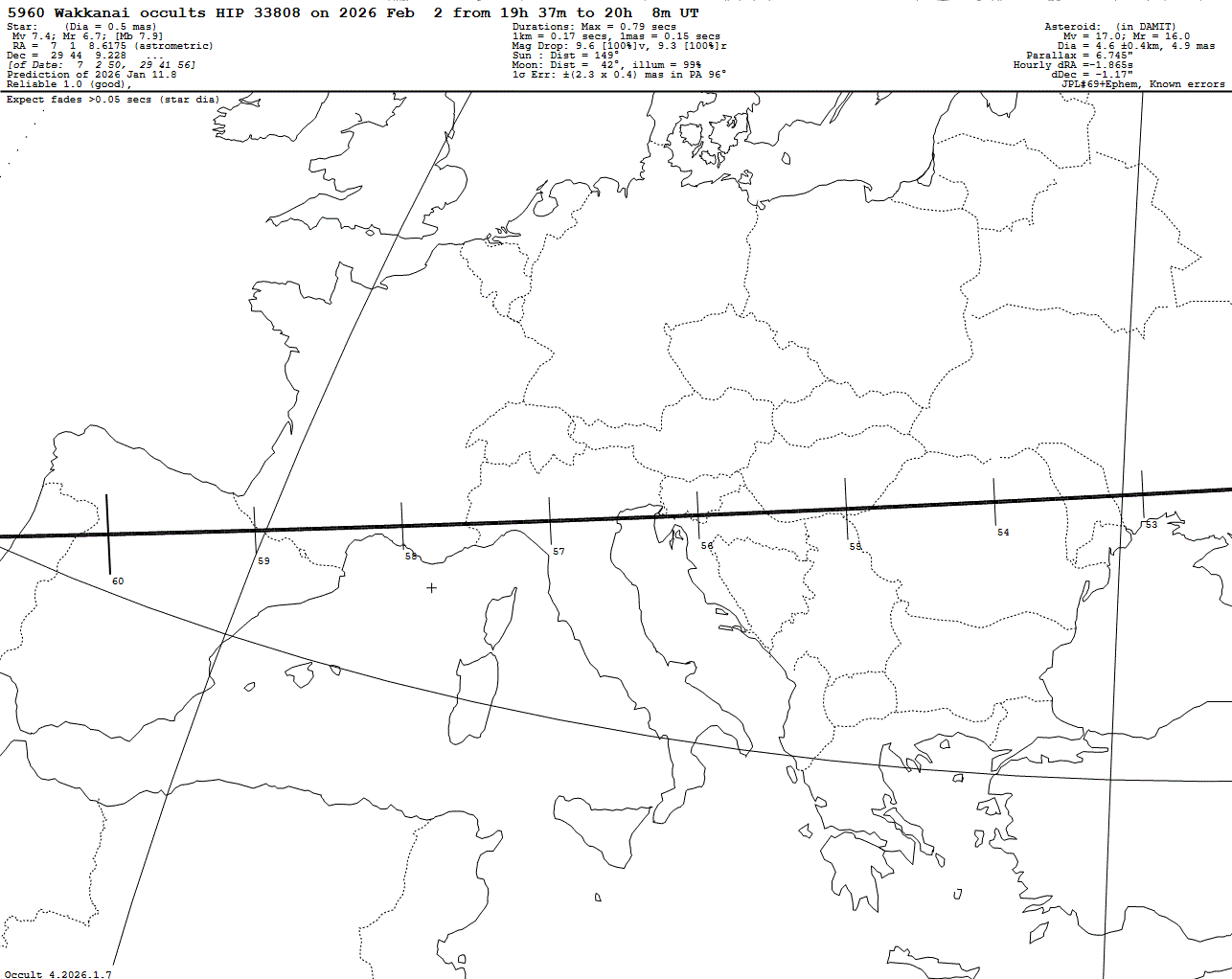 Bright star! Short max. duration of only 0.79 s! Last update: 2026 Jan 11, Occult Watcher Cloud: https://cloud.occultwatcher.net/event/1858-5960-99628-649866-H33808 Post navigation 2026 Feb 02 ~23:37 UT: (14488) 1994 TF15 occults UCAC4 516-051382 (8.7 mag) 2026 Feb 01 ~00:23 UT: (8995) Rachelstevenson occults TYC 2369-01598-1 (8.5 mag)