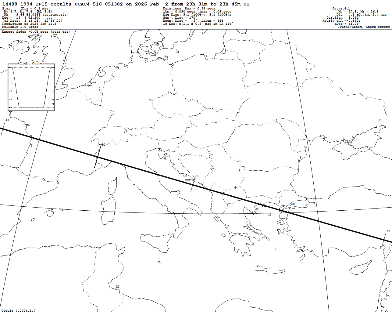 Bright star! Short max. duration of only 0.39 s! Last update: 2026 Jan 11, Occult Watcher Cloud: https://cloud.occultwatcher.net/event/1858-14488-138641-648813-U051382 Post navigation 2026 Feb 03 ~20:19 UT: (22676) 1998 QS41 occults HIP 2988 (7.4 mag) 2026 Feb 02 ~19:53 UT: (5960) Wakkanai occults HIP 33808 (7.4 mag)
