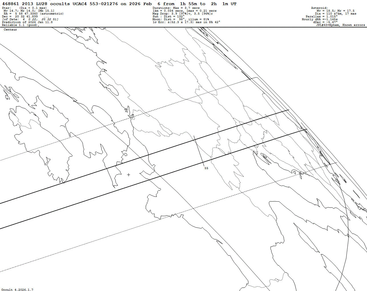 Centaur! Very faint star! 1-sigma error limits cover large parts of Europe! Last update: 2026 Jan 11, Occult Watcher Cloud https://cloud.occultwatcher.net/event/1862-468861-84910-649291-U021276 Prediction of the Lucky Star project (2026 Jan 09): https://lesia.obspm.fr/lucky-star/occ.php?p=173048 Post navigation 2026 Feb 20 ~21:56 UT: (54598) Bienor occults UCAC4 629-041023 (15.2 mag)