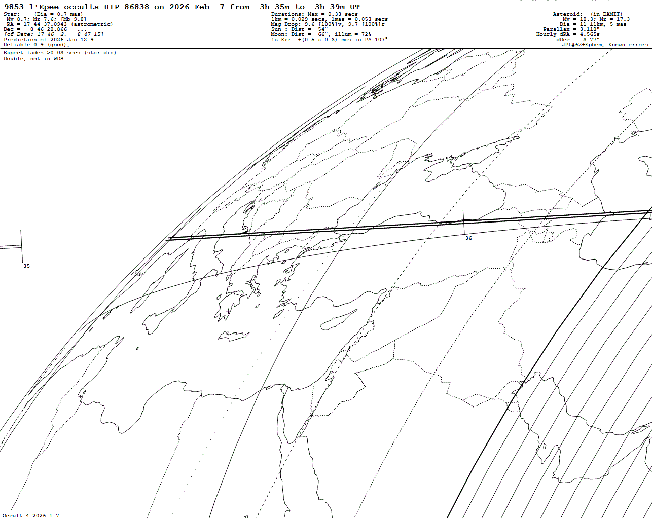 2026 Feb 07 ~03:35 UT: (9853) l’Epee occults HIP 86838 (8.7 mag)