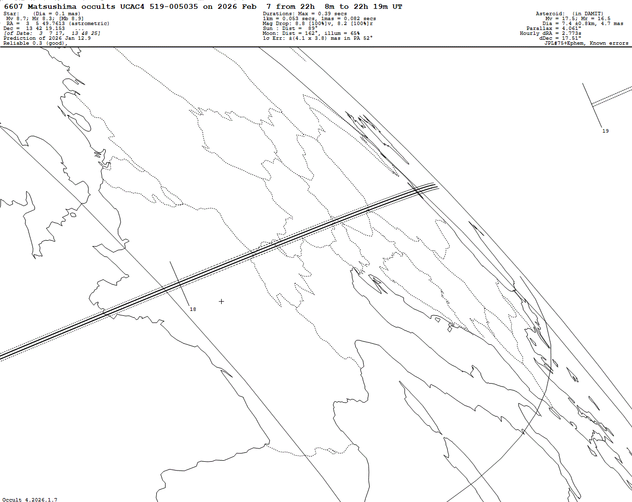 Bright star! Short max. duration of only 0.39 s! Last update: 2026 Jan 12, Occult Watcher Cloud: https://cloud.occultwatcher.net/event/1863-6607-44126-648868-U005035 Post navigation 2026 Feb 08 ~04:52 UT: (8944) Ortigara occults HIP 86778 (8.1 mag) 2026 Feb 07 ~03:35 UT: (9853) l’Epee occults HIP 86838 (8.7 mag)