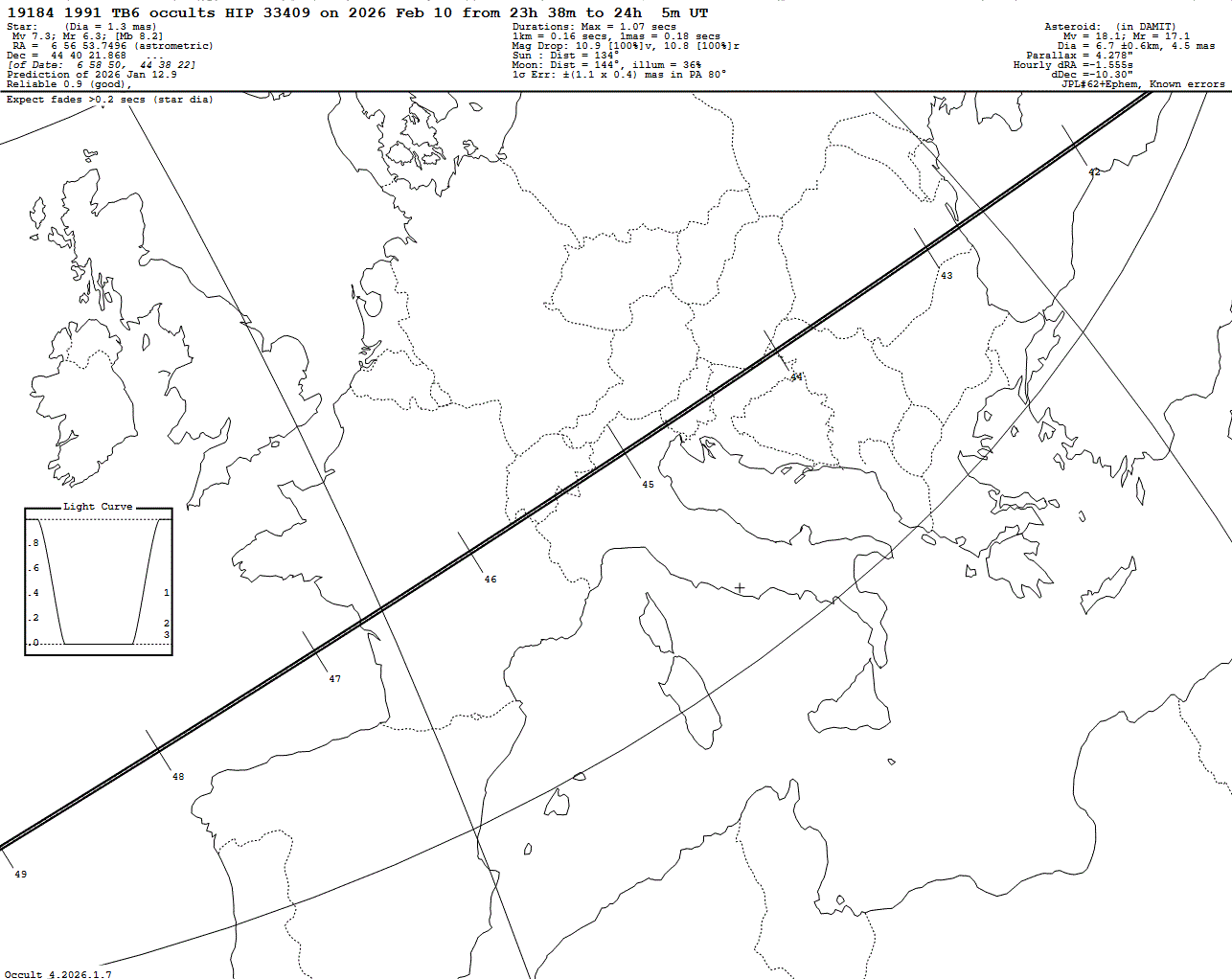 Bright star! Last update: 2026 Jan 12, Occult Watcher Cloud: https://cloud.occultwatcher.net/event/1866-19184-98684-650805-H33409 Post navigation 2026 Feb 11 ~03:34 UT: (16877) 1998 BW6 occults TYC 6811-02647-1 (9.0 mag) 2026 Feb 10 ~01:36 UT: (9332) 1990 SB1 occults HIP 71943 (7.6 mag)