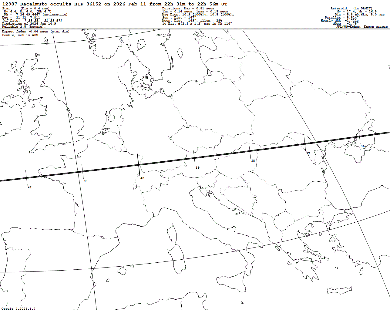 Bright star! Short max. duration of only 0.81 s! Last update: 2026 Jan 14, Occult Watcher Cloud: https://cloud.occultwatcher.net/event/1867-12987-105654-649350-H36152 Post navigation 2026 Feb 14 ~22:12 UT: (16242) Licato occults J084059.40-004147.2 (8.2 mag) 2026 Feb 11 ~03:45 UT: (19072) 1222 T-3 occults UCAC4 329-074079 (8.0 mag)