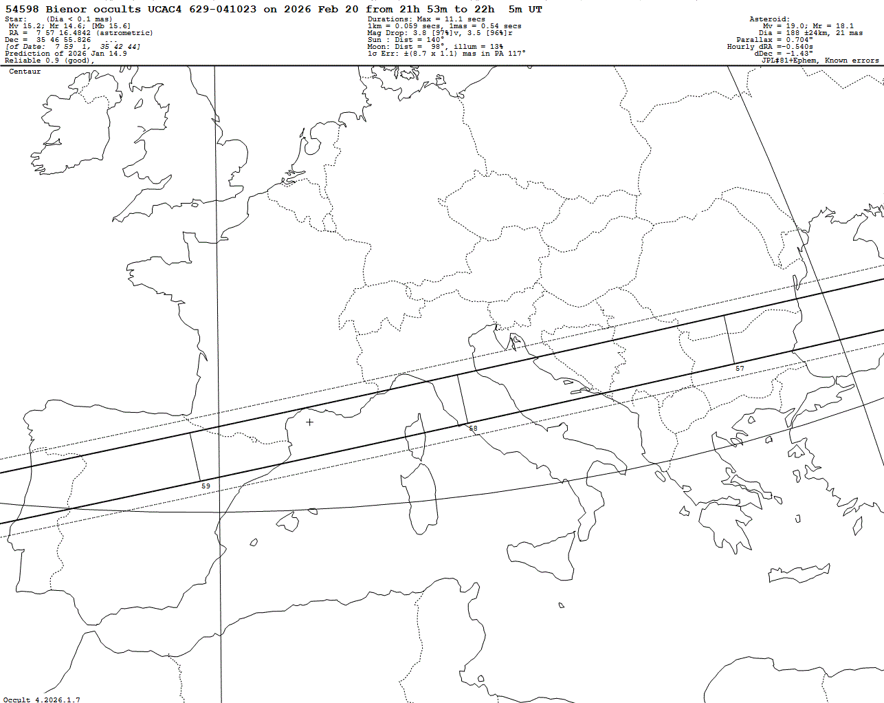 Centaur! Very faint star! Last update: 2026 Jan 14, Occult Watcher Cloud https://cloud.occultwatcher.net/event/1876-54598-112865-650244-U041023 Prediction of the Lucky Star project (2025 Aug 24): https://lesia.obspm.fr/lucky-star/occ.php?p=155339 Post navigation 2025 Dec 31 ~02:48 UT: (447178) 2005 RO43 occults UCAC4 368-040059 (15.2 mag) 2026 Feb 06 ~01:54 UT: (468861) 2013 LU28 occults UCAC4 553-021276 (14.7 mag)