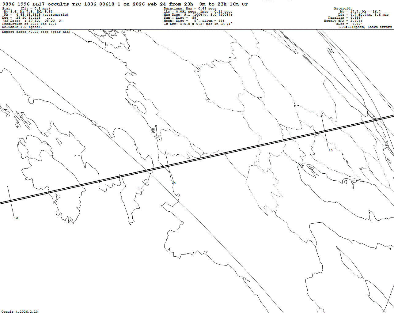 2026 Feb 24 ~23:13 UT: (9896) 1996 BL17 occults TYC 1836-00618-1 (8.6 mag)