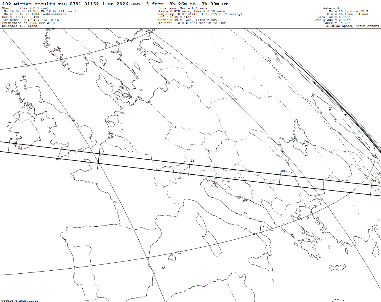 Slow-rotating asteroid! Faint mag drop of only 0.8 mag! Last update: 2025 Dec 27, Occult Watcher Cloud: https://cloud.occultwatcher.net/event/1828-102-110463-648825-T01152-1 Post navigation 2026 Jan 03 ~01:35 UT: (17967) Bacampbell occults TYC 1324-02270-1 (8.3 mag) 2026 Jan 03 ~03:30 UT: (102) Miriam occults J074720.02+131210.3 (13.2 mag)