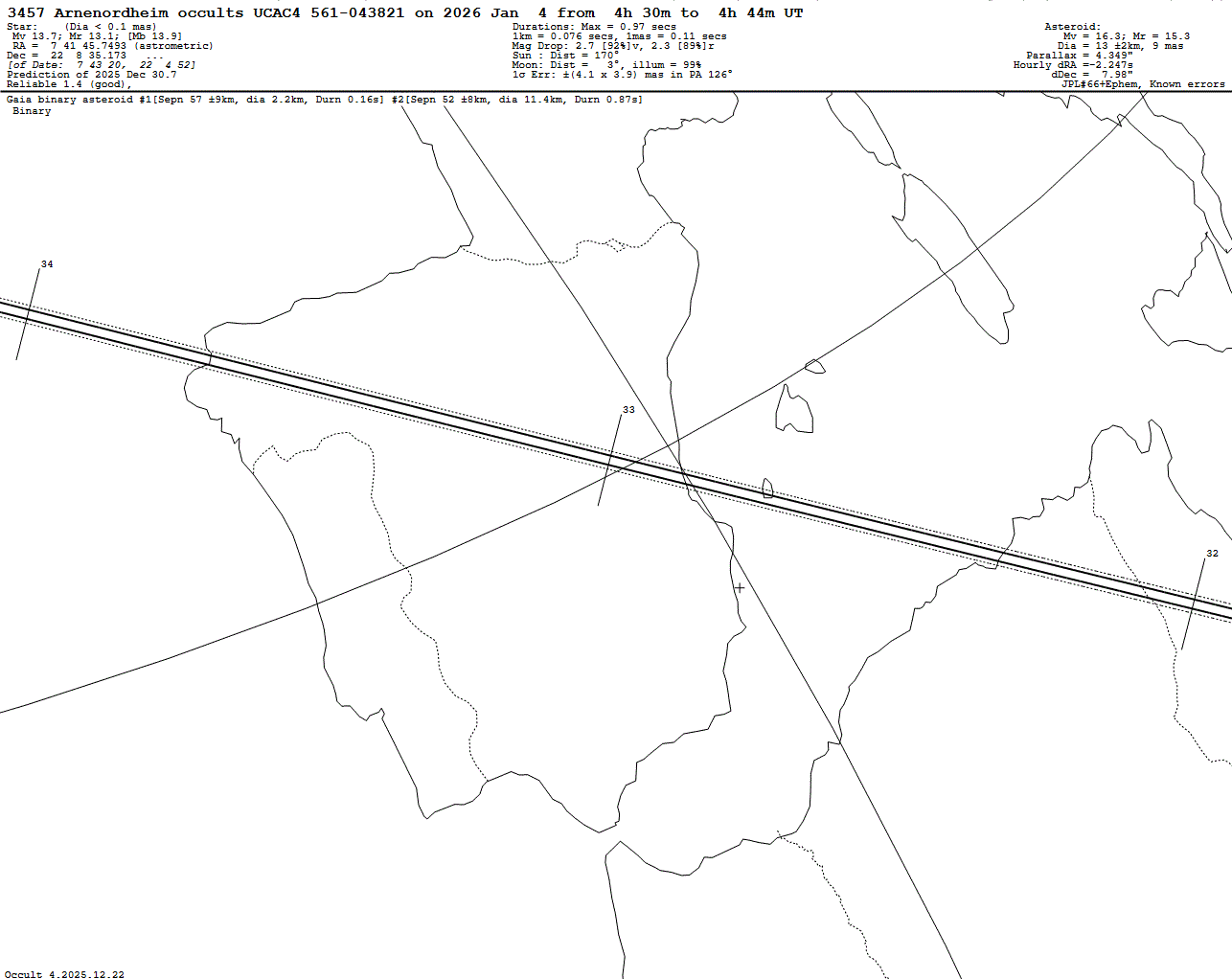 Suspected binary asteroid! Short max. duration of only 0.97 s! Last update: 2025 Dec 30, Occult Watcher Cloud: https://cloud.occultwatcher.net/event/1829-3457-109172-649387-U043821 GAIAMOONS link: https://gaiamoons.imcce.fr/occ.php?p=100433 Post navigation 2026 Jan 04 ~02:29 UT: (22510) 1997 YV7 occults TYC 1878-00731-1 (8-7 mag) 2026 Jan 04 ~22:40 UT: (617) Patroclus and Menoetius occult UCAC4 541-004490 (11.9 mag)