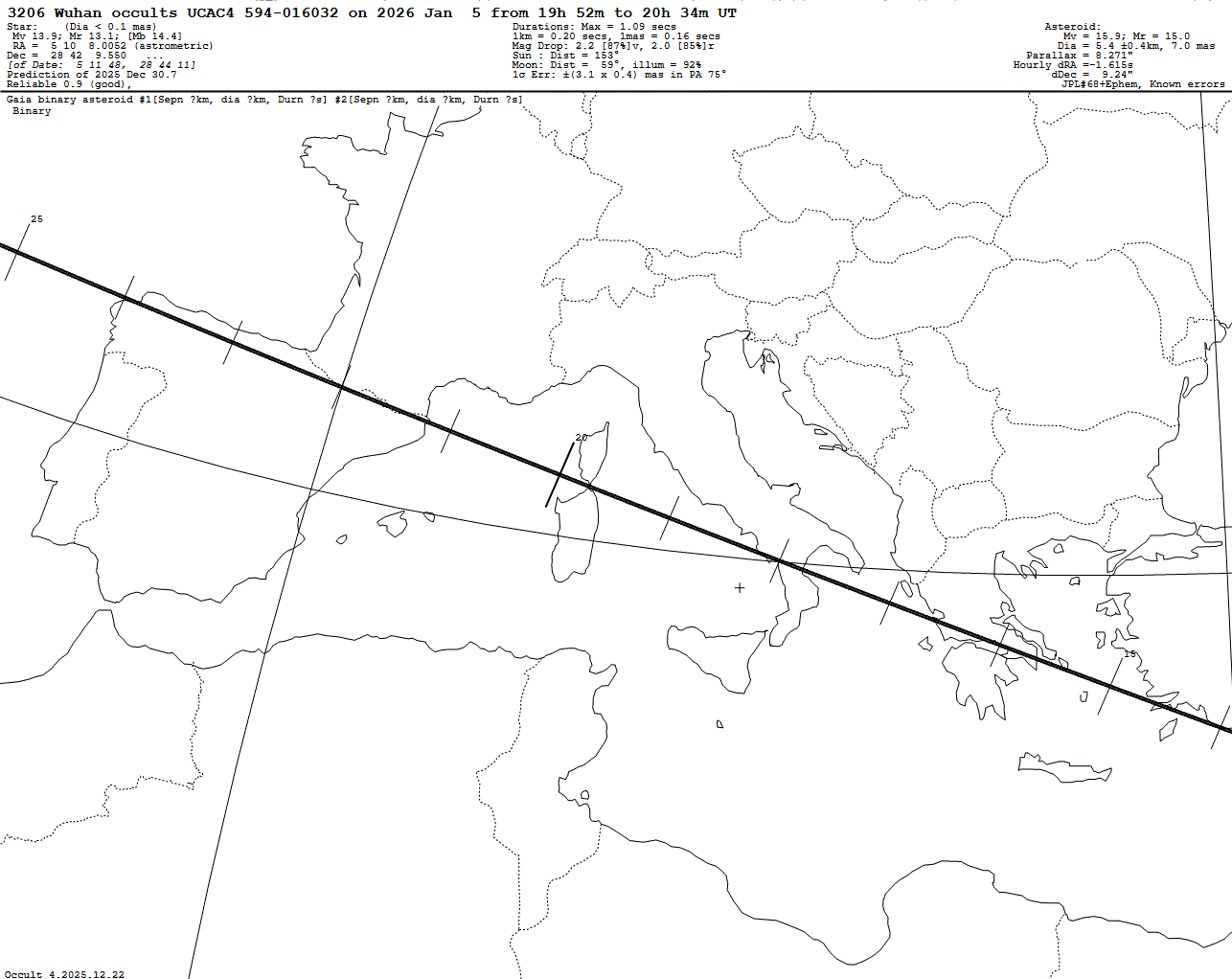 Suspected binary asteroid! Last update: 2025 Dec 30, Occult Watcher Cloud: https://cloud.occultwatcher.net/event/1830-3206-73468-649806-U016032 GAIAMOONS link: https://gaiamoons.imcce.fr/occ.php?p=109182 Post navigation 2026 Jan 04 ~23:33 UT: (265) Anna occults UCAC4 709-046886 (12.2 mag) 2026 Jan 05 ~20:53 UT: (834) Burnhamia occults UCAC4 534-041320 (14.0 mag)