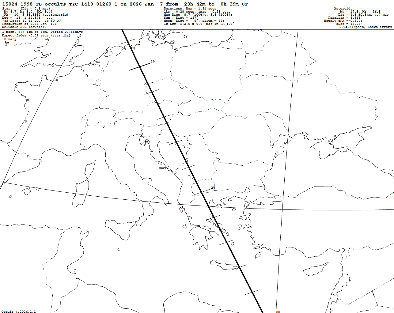 Bright star! Possible binary asteroid! Last update: 2026 Jan 01, Occult Watcher Cloud: https://cloud.occultwatcher.net/event/1832-15024-144051-648936-T01260-1 Post navigation 2026 Jan 06 ~21:55 UT: (6644) Jugaku occults HIP 46187 (7.9 mag) 2026 Jan 19 ~20:36 UT: (9220) Yohisdayama occults HIP 30049 (6.8 mag)