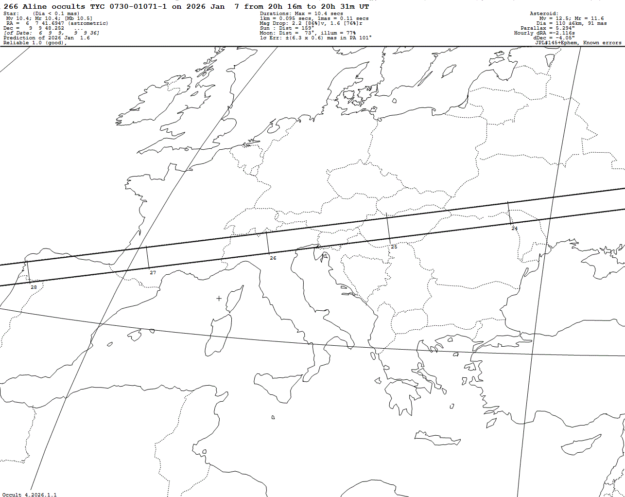 Slow-rotating asteroid! Last update: 2025 Dec 27, Occult Watcher Cloud: https://cloud.occultwatcher.net/event/1832-266-86979-648576-T01071-1 Post navigation 2026 Jan 10 ~00:00 UT: (3955) Bruckner occults TYC 2401-00305-1 (7.8 mag)